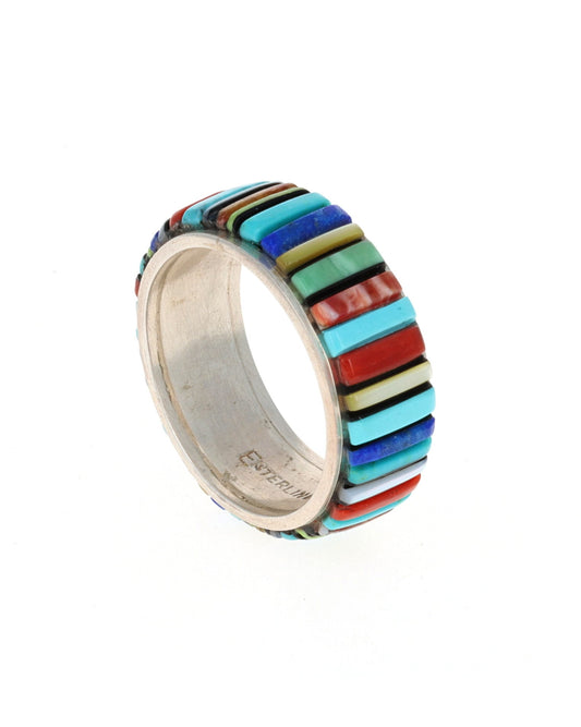 Zuni jewelry is known for using many small stones arranged in careful patterns to create detailed pieces. The fine stonework typically features carefully cut and polished stones set in delicate silverwork. The Zuni often build up complex designs through their precise inlay, petit point, or needlepoint work.
