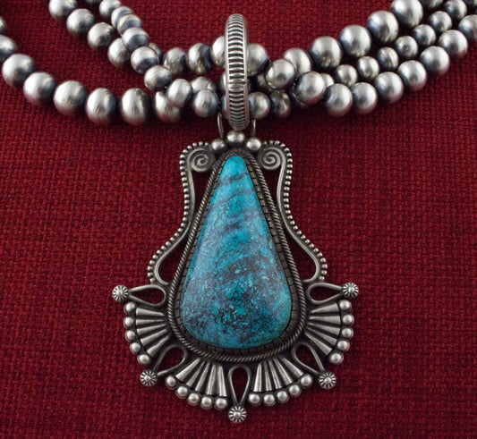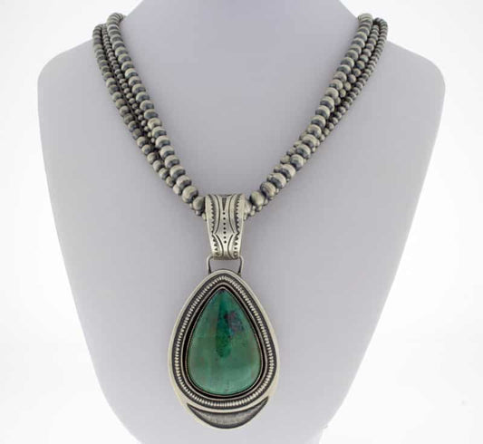 Handmade 3-Strand Sterling Silver Bead Necklace With Natural Chrysocolla Pendant