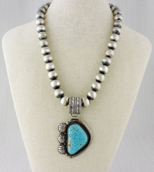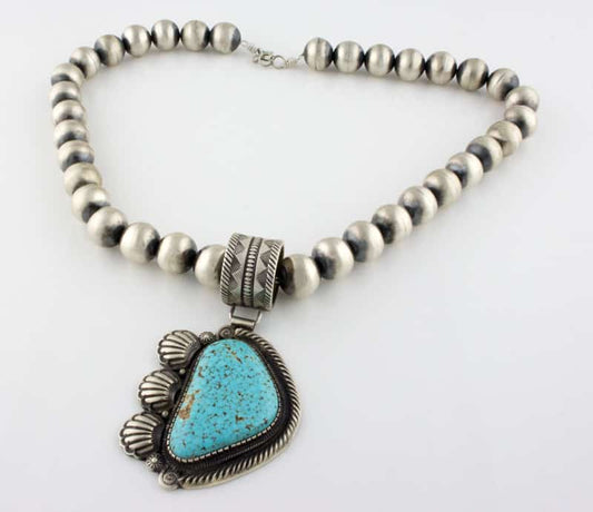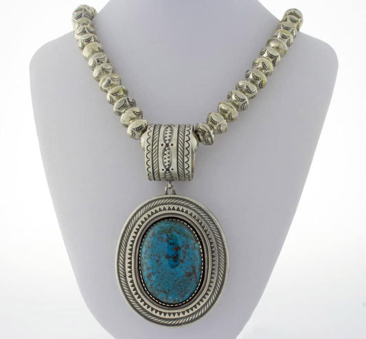 Handmade Sterling Silver Bead Necklace With Natural China Mountain Turquoise Pendant