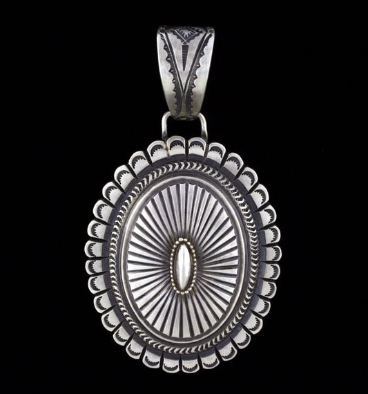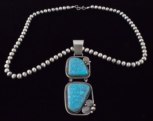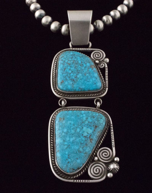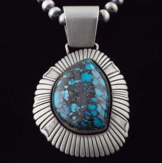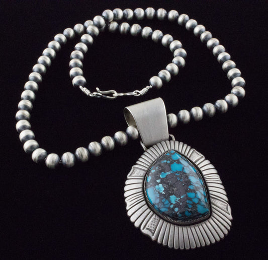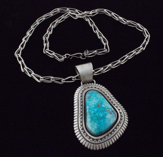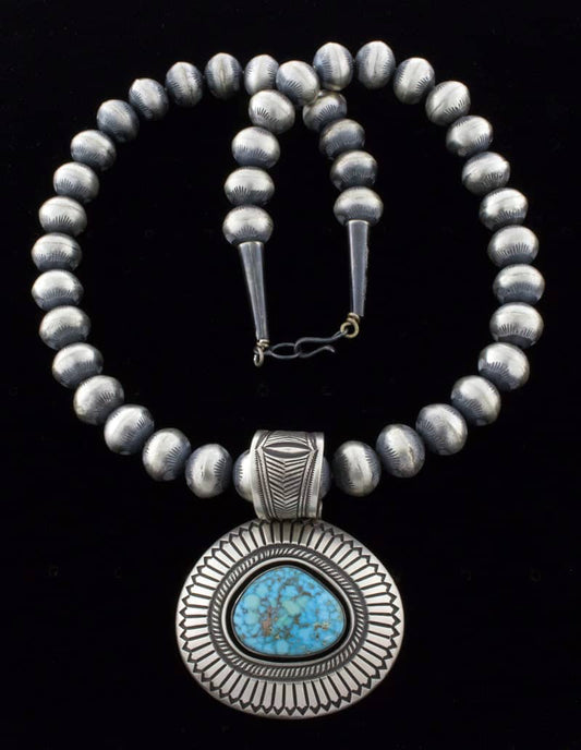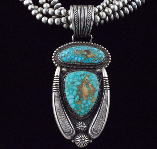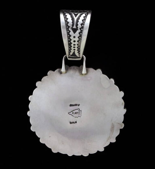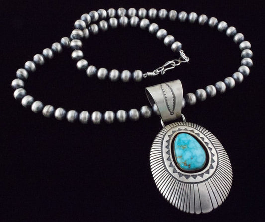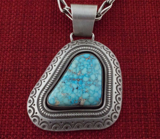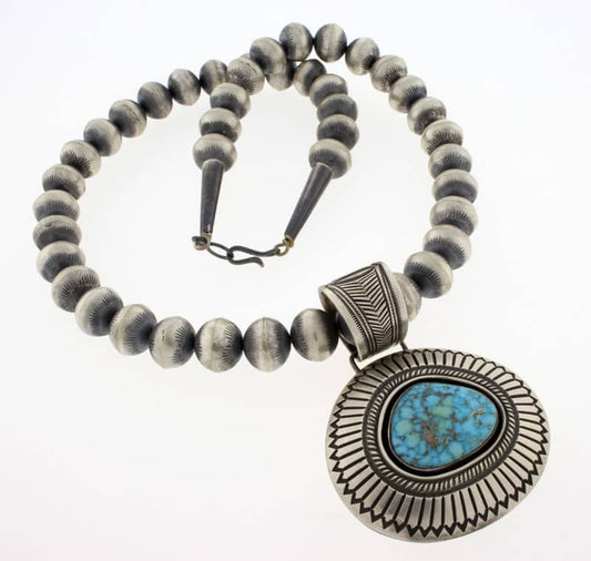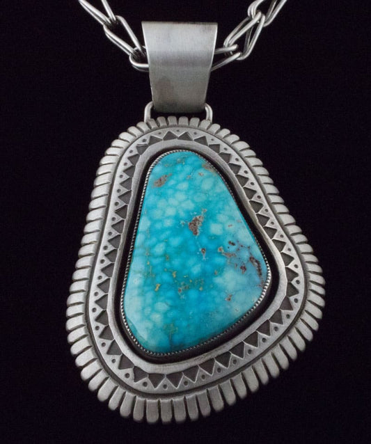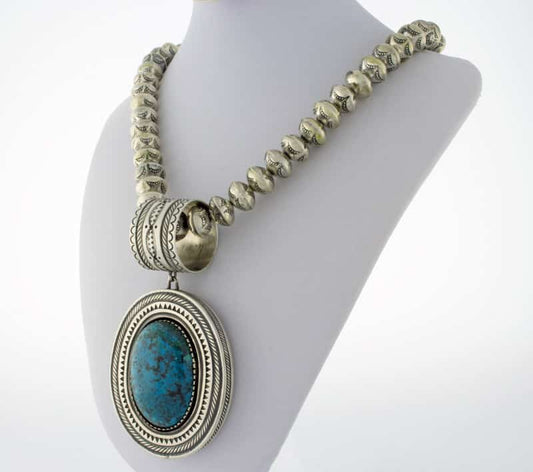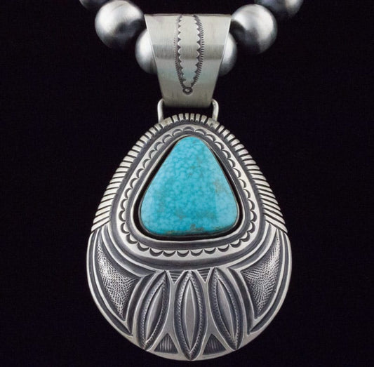 The majority of Martinez's necklaces and pendants feature a single turquoise stone set in hand-stamped sterling silver. Some of his necklaces are strung with strands of Navajo pearls, while others are made with link chains. These pieces are perfect for those who want to make a statement.
