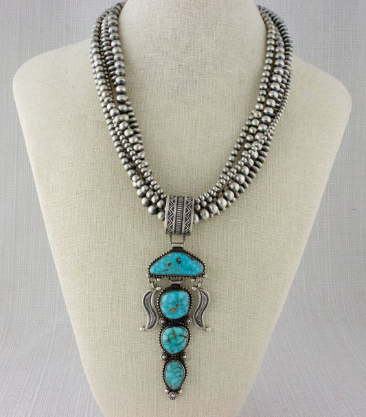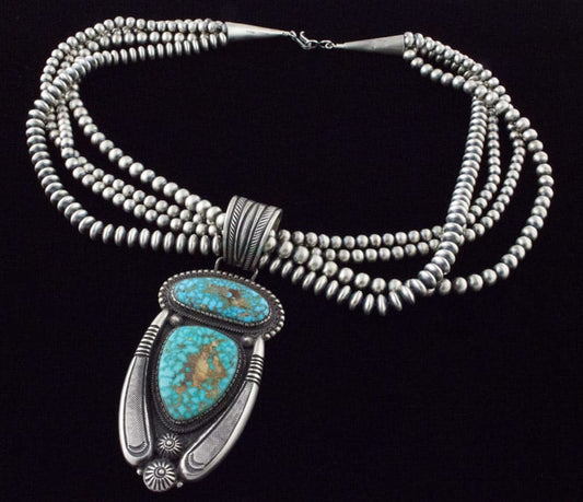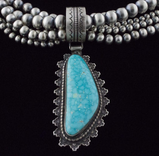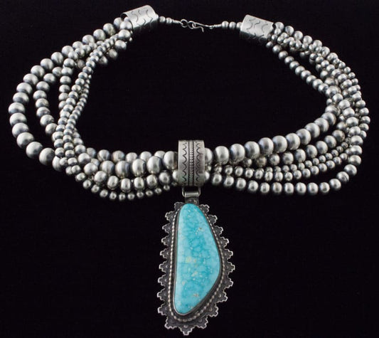 Handmade 4-Strand Sterling Silver Bead Necklace With Natural Birdseye Kingman Turquoise Pendant