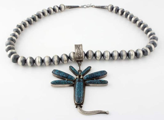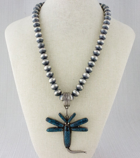 Handmade Sterling Silver Bead Necklace With Natural China Mountain Turquoise Dragonfly Pendant