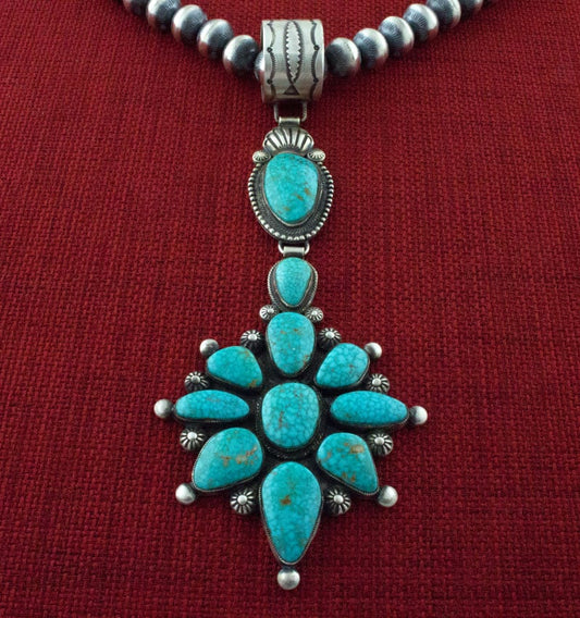 Handmade Sterling Silver Bead Necklace With Natural Birdseye Kingman Turquoise Cluster Pendant