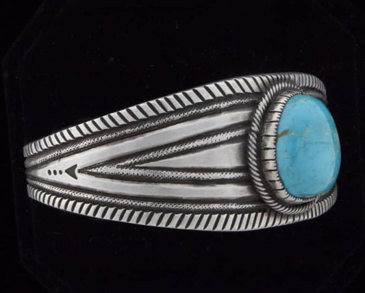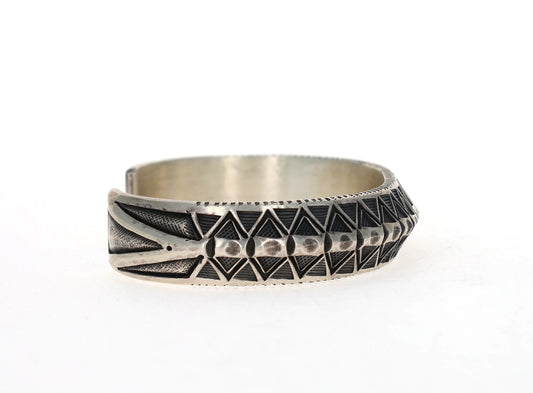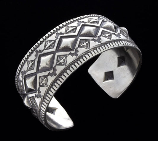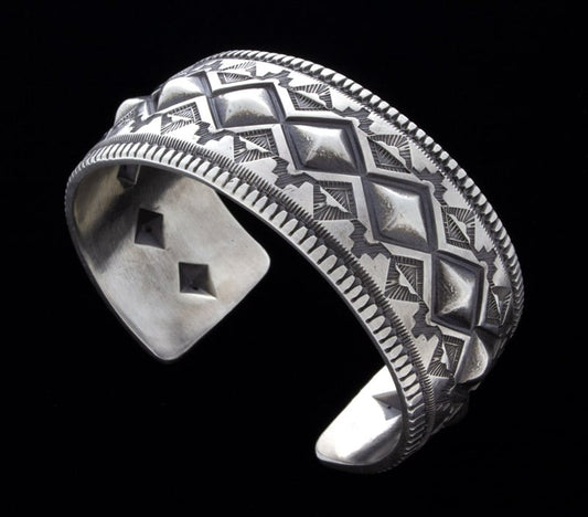 Calvin Martinez's bracelets are celebrated for their distinct artistry. They feature a wide range of designs, patterns, and techniques. His bracelet collection includes traditional sterling silver bracelets with timeless appeal as well as more elaborate, visually striking pieces embellished with turquoise. He also makes use of textures and shapes to create innovative 3D designs.
