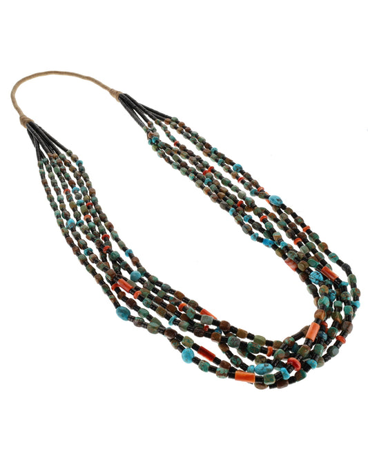 Daniel favors necklaces made of multiple strands of hand-shaped jet, abalone, and turquoise beads. He creates bead shapes that include discs, nuggets, and tubes, providing textural variety and visual movement throughout each composition. The artist’s designs range from elegant single-strand pieces to elaborate seven-strand necklaces, sometimes featuring matching inlay pendants as focal points. Some of the popular styles include traditional heishi beadwork, mixed stone arrangements, and classic squash blossom designs.