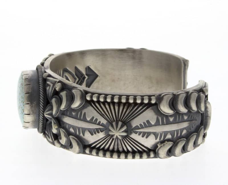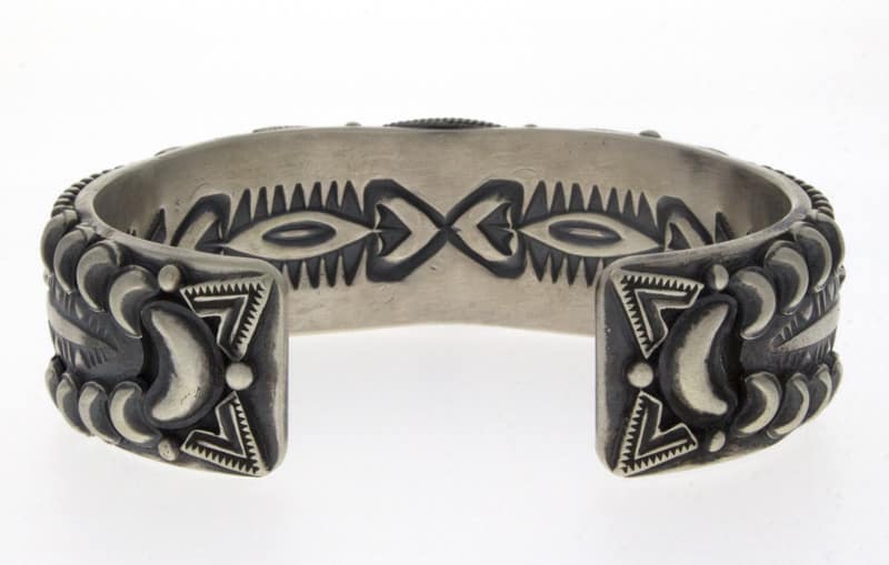 • Technique:   Stamp Work, Saw Work, Appliqué, Repoussé, Hand Sawed Castellated Bezel, Twist Wire, Satin Finish, Oxidized Background