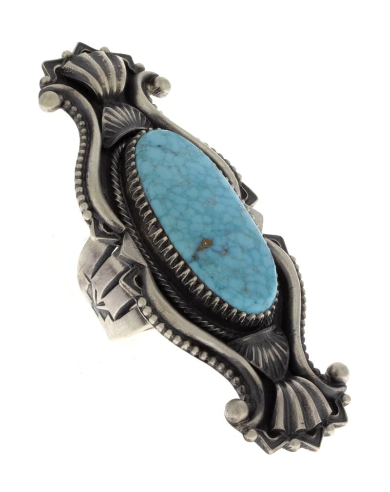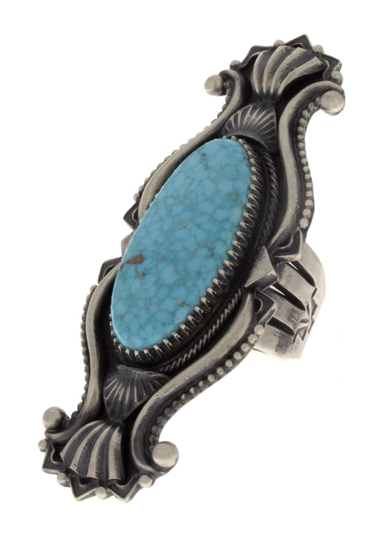 Size 7.75 "Old Style" Sterling Silver Ring Set With A Large Oval Shaped Natural Birdseye Kingman Turquoise Stone. Masterfully Handmade And Designed By Navajo Artist DERRICK GORDON.