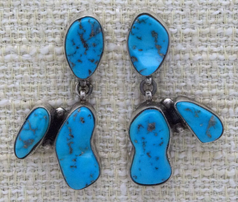 Sterling Silver Post-Dangle Earrings Each Set With 3 Free-Form Kingman Turquoise Stones. Masterfully Handmade And Designed By Navajo Artist JERRYSON HENIO.