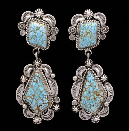 Sterling Silver Post-Dangle Earrings Each Set With 2 RARE High Grade Natural #8 Micro-Web Turquoise Stones Mined Circa The Late 1970's Period.  Masterfully Handmade And Designed By Navajo Artist ELLA M. LINKIN.