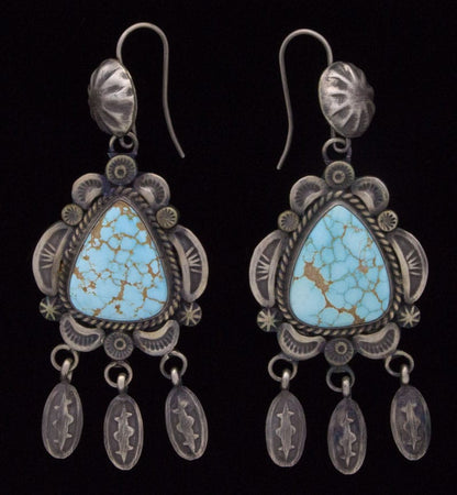 "Old Style" Sterling Silver Earrings Each Set With A High Grade Natural #8 Turquoise Stone Mined Circa The 1970's Period.  Masterfully Handmade And Designed By Navajo Artist ELLA M. LINKIN.
