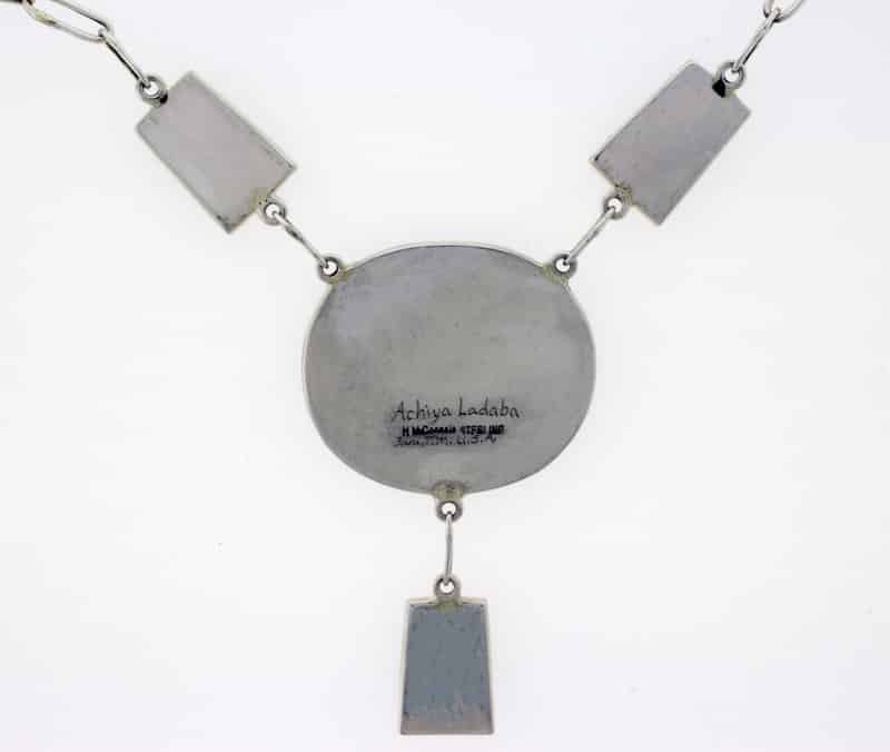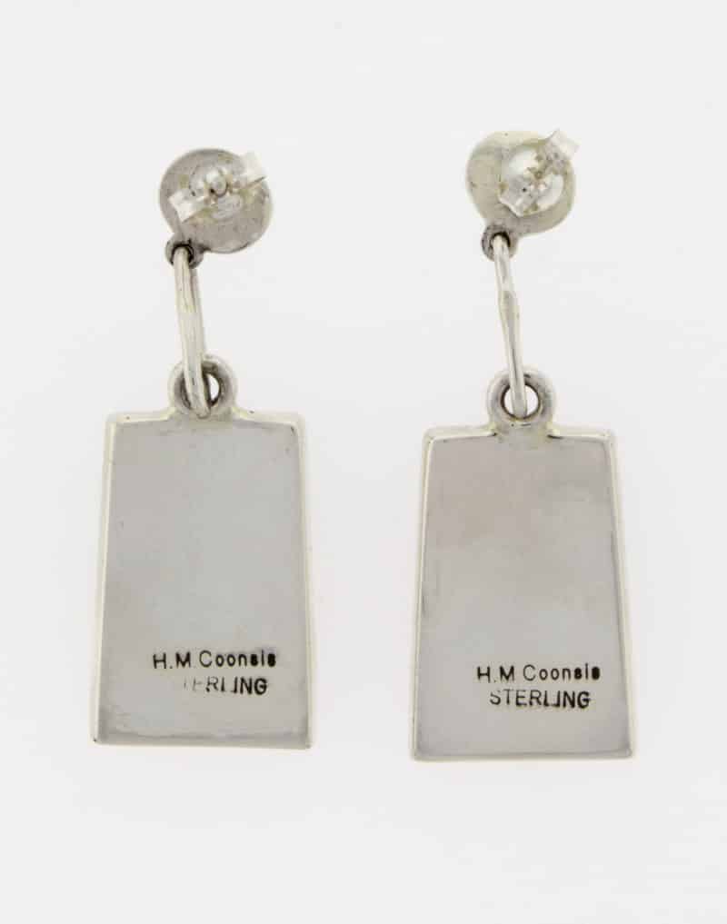 • Artist Hallmark:  "H M Coonsis" (inscribed on back side of necklace and each earring; Zuni words "Achiya Ladaba" ["Knife Wing"] also inscribed on back of necklace.)