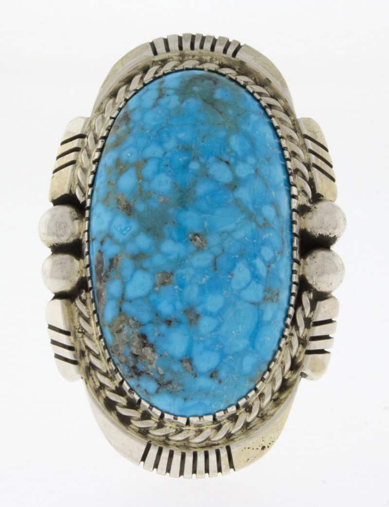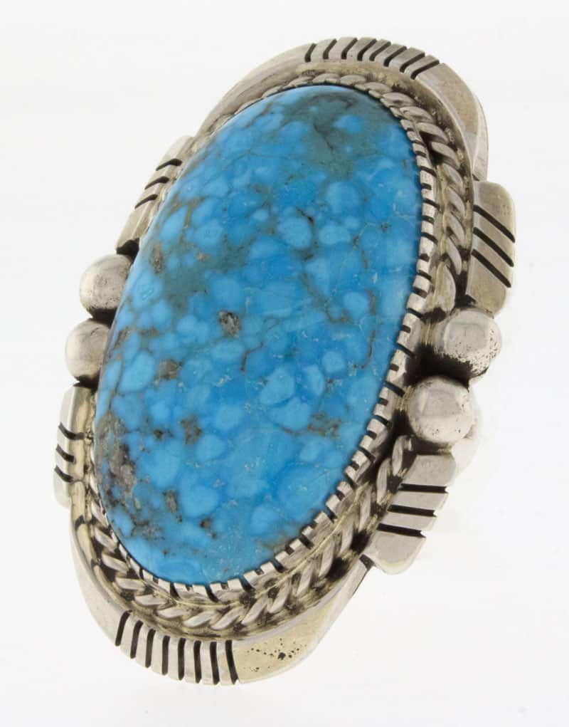 Size 9 Sterling Silver Ring Set With A High Grade Natural Birdseye Kingman Turquoise Stone.  Masterfully Handmade And Designed By Navajo Artist JOELIUS DRAPER.