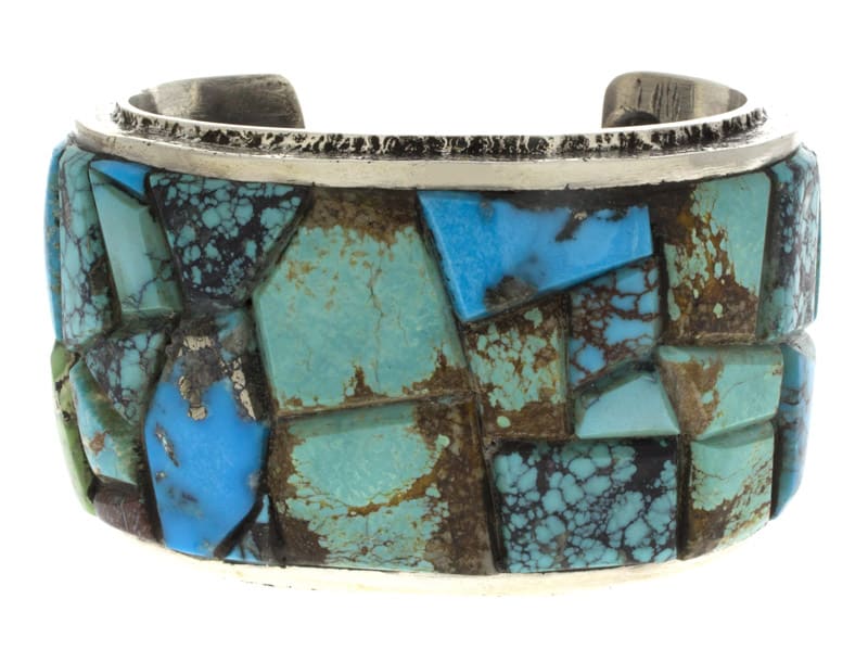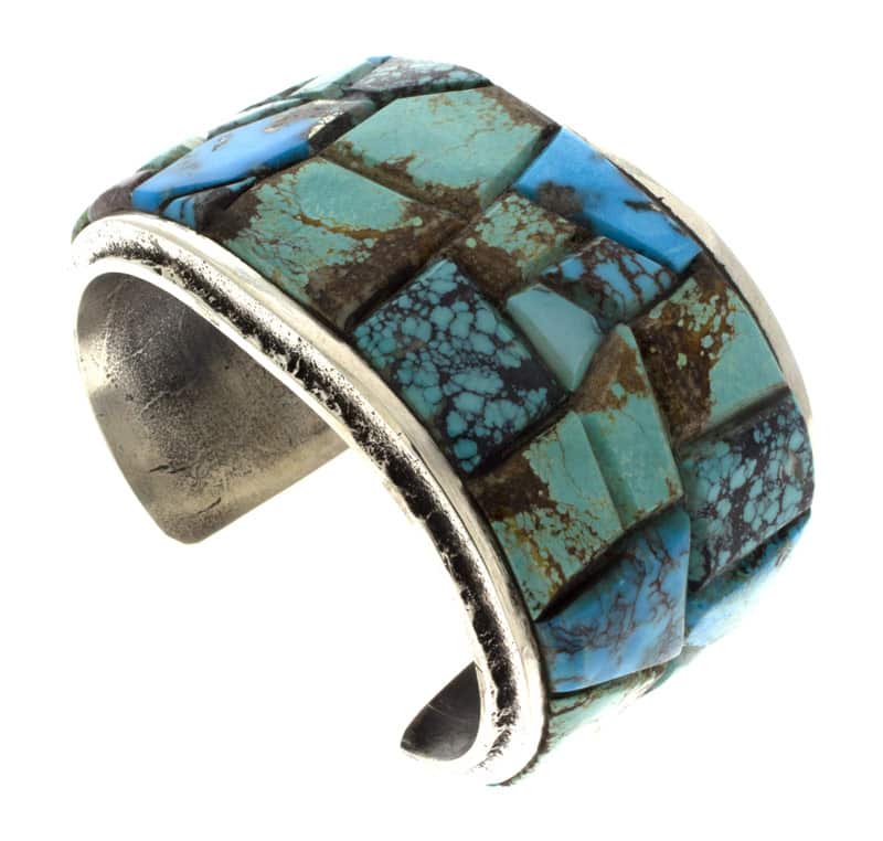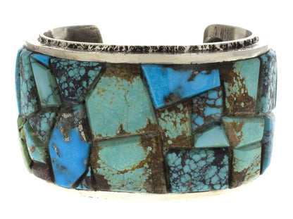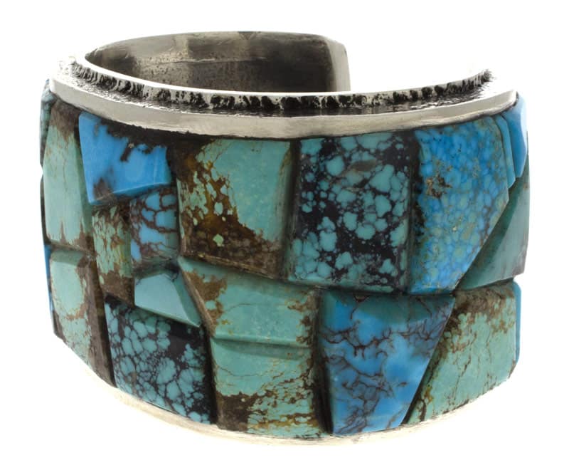 Heavy Gauge Tufa Stone Cast Sterling Silver Bracelet With Raised Cobblestone Turquoise Inlay Design.  Inlaid Turquoise Stones Consist Of Kingman Turquoise, #8 Turquoise, China Mountain Turquoise And Turquoise Mountain Turquoise.  Masterfully Handmade And Designed By Navajo Artist LESTER JAMES.