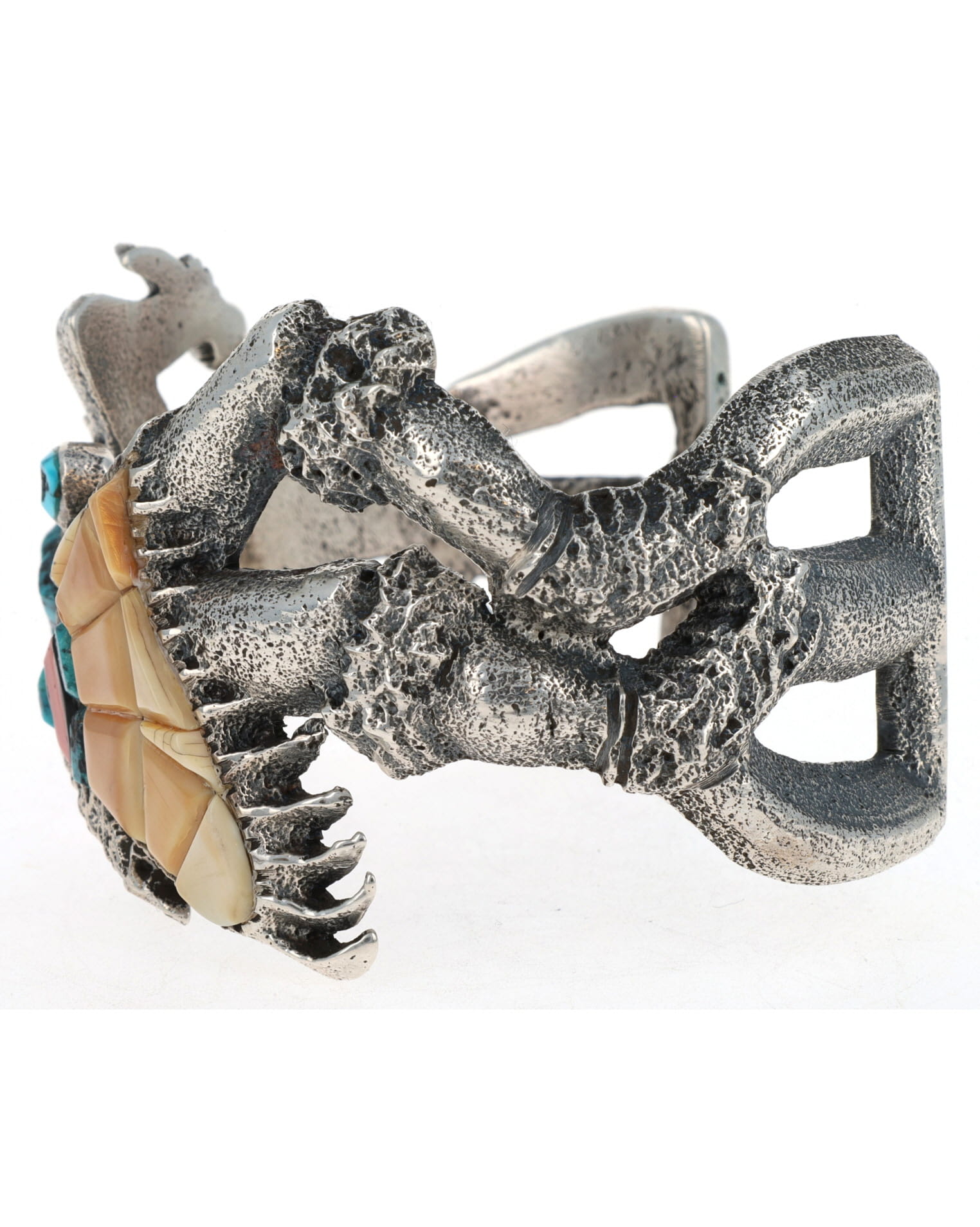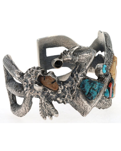 Tufa Stone Cast Sterling Silver  Native American Dancer Bracelet With Multi-Color Raised Cobblestone Inlay Design.  Inlaid Stones Consist Of Kingman Turquoise, Fossilized Ivory, Mediterranean Coral, Jet & Onyx.  Masterfully Handmade And Designed By Navajo Artist LESTER JAMES.