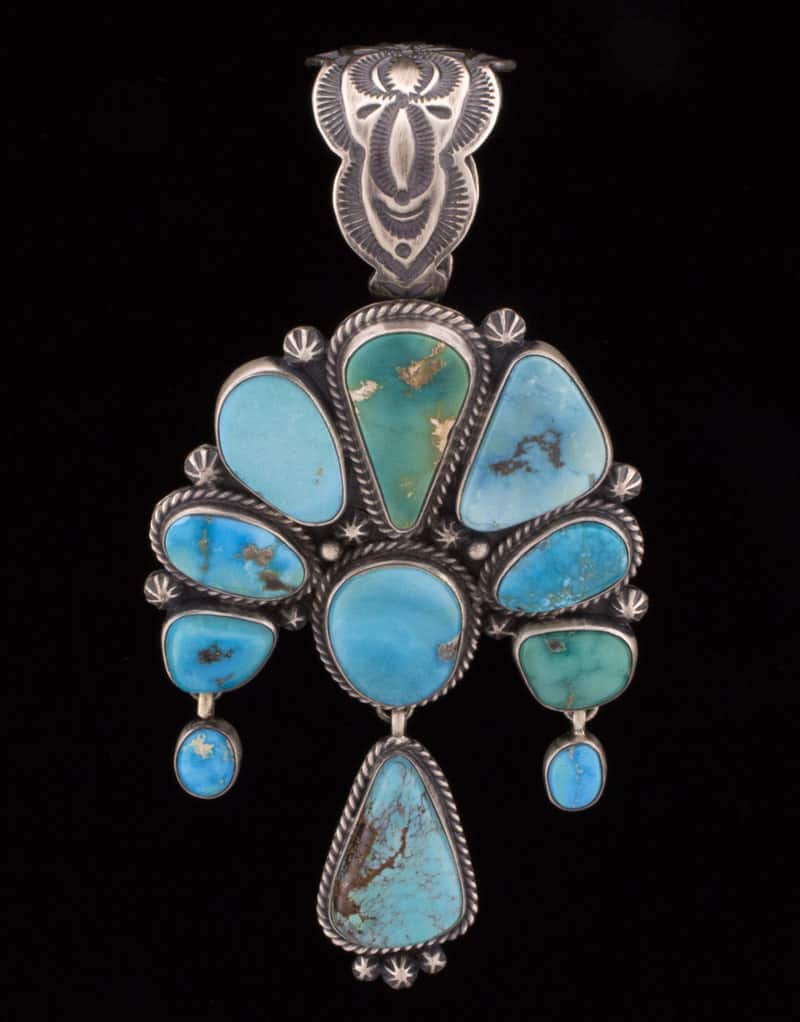 "Old Style" Sterling Silver Pendant Set With A Cluster Of 11 Natural Royston Turquoise Stones, Including 2 Dangles & 1 Drop.  Pendant Masterfully Handmade And Designed By Navajo Artist MURPHY PLATERO.  Sterling Silver Bail Is A Cast Design By Navajo Artist ELGIN TOM.