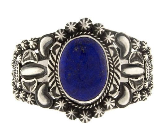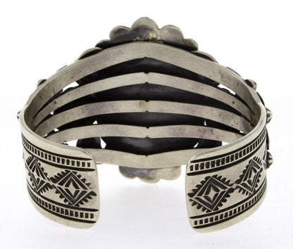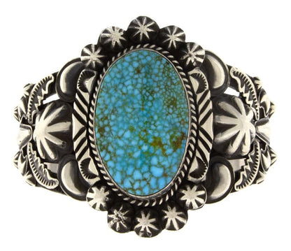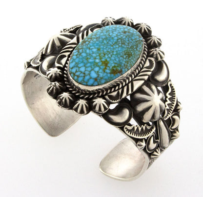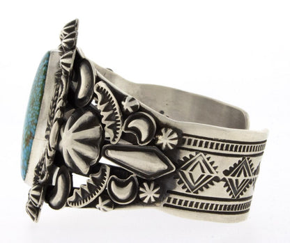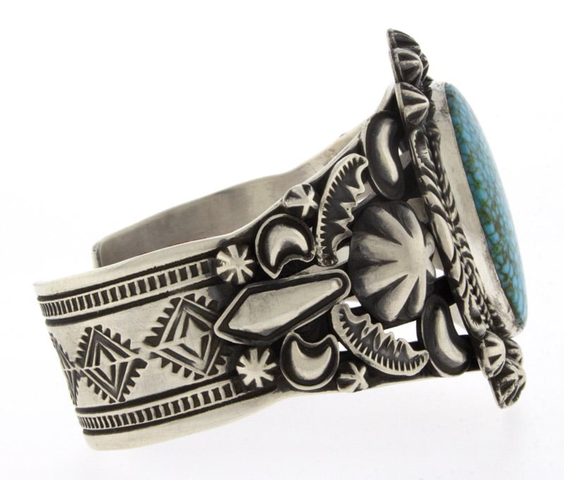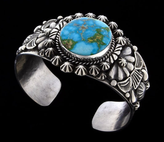 "Old Style" Sterling Silver Bracelet Set With A Large Oval Shaped Natural Birdseye Kingman Turquoise Stone. Masterfully Handmade And Designed By Navajo Artist RICK WERITO.