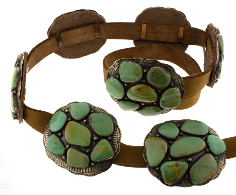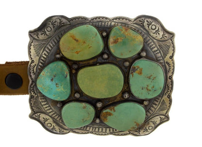 Echter Leder Gürtel einschließlich 8 handgefertigter Sterling Silber Conchos und Schnalle, jeweils besetzt mit einem Cluster aus 7 Türkis-Mountain Türkis Steinen. Das Gesamtgewicht aller 56 Türkis Steine wird auf 1,240 Karat geschätzt. Meisterhaft handgefertigt und entworfen von dem Navajo-Künstler DAN MARTINEZ. Alle Conchos und die Schnalle mit Lederunterlage.