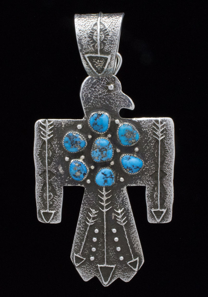 Tufa-Stein-Guss-Sterlingsilber-Thunderbird-Anhänger mit einem zentralen Cluster aus 7 Kingman-Turquoise-Steinen. Meisterhaft handgefertigt und entworfen von dem Navajo-Künstler DELBERT ARVISO.