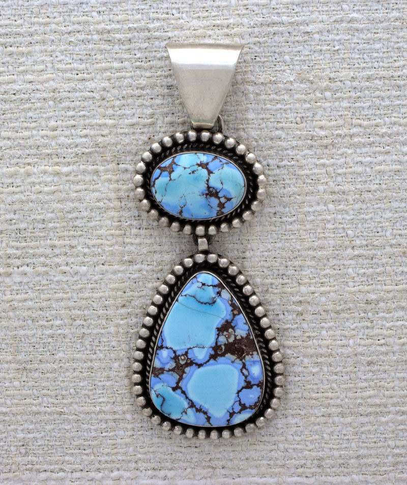 "Old Style" Sterlingsilber-Anhänger mit 2 vertikal gestapelten natürlichen Golden Hill Türkissteinen. Meisterhaft handgefertigt und entworfen von der Navajo-Künstlerin MARY ELLEN WILLIE.