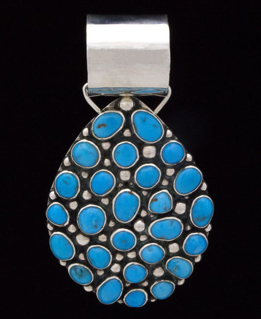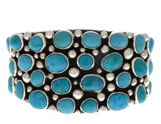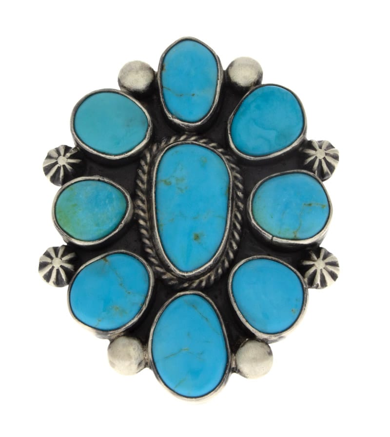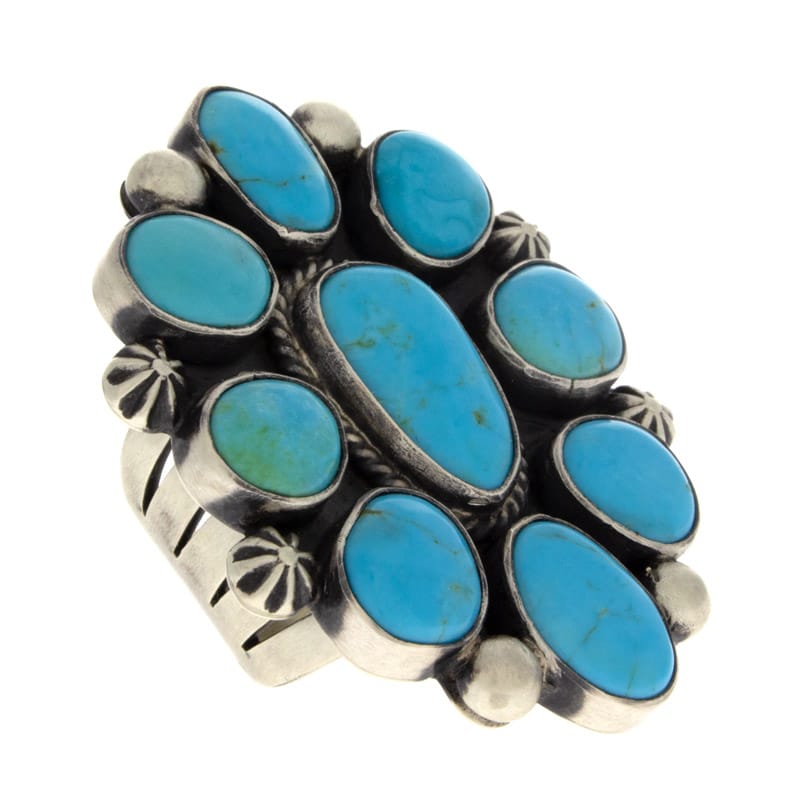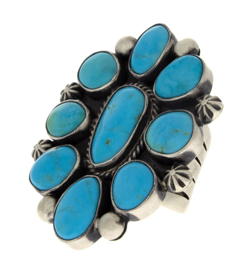 Größe 6,5 "Old Style" Sterlingsilberring, besetzt mit einem Cluster aus 9 natürlichen Bluebird-Turquoise-Steinen. Meisterhaft handgefertigt und entworfen von dem Navajo-Künstler PHILBERT SECATERO.
