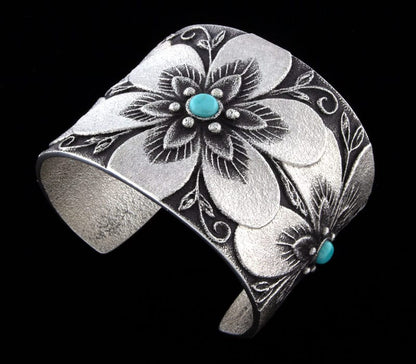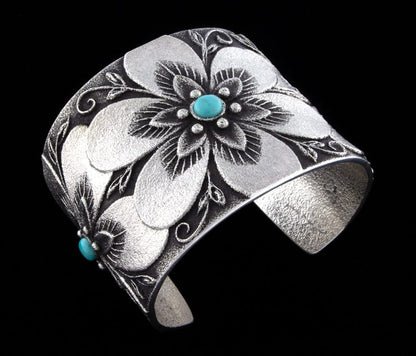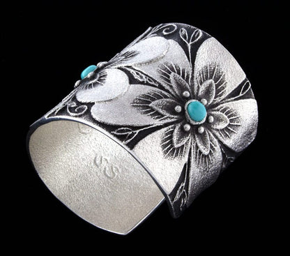 Tufa-Stein-Guss-Sterlingsilber-Armband mit 3 Blumen, wobei jede Blume mit einem natürlichen klaren Lone Mountain Türkisstein besetzt ist. Meisterhaft handgefertigt und entworfen von der Navajo-Künstlerin REBECCA T. BEGAY.