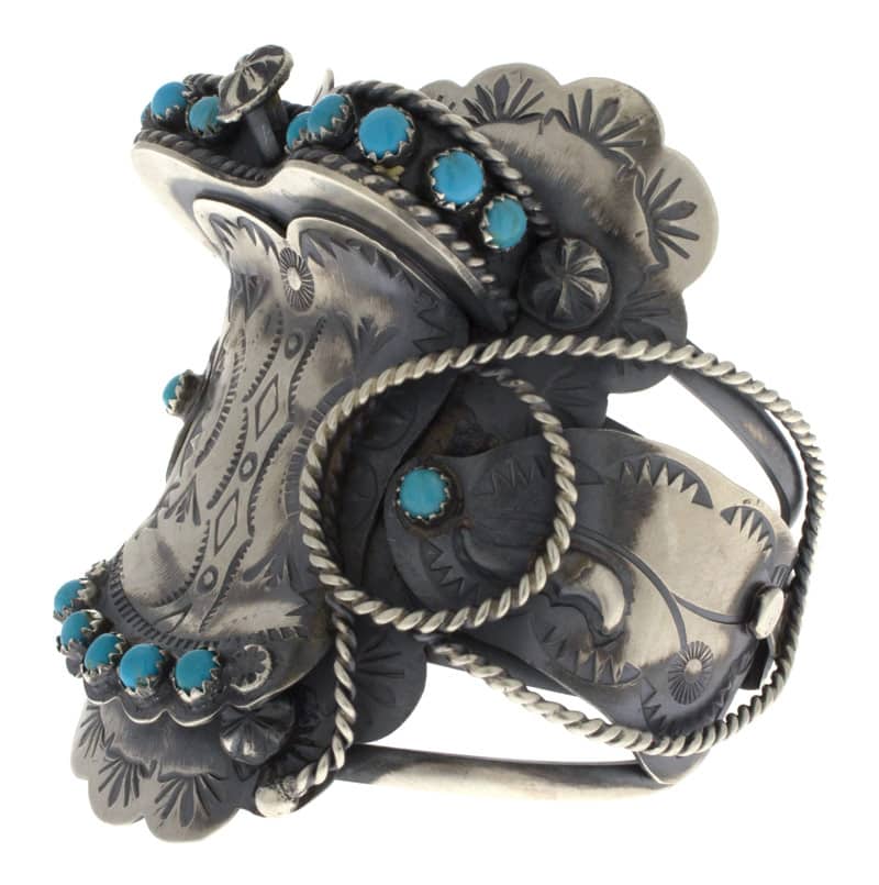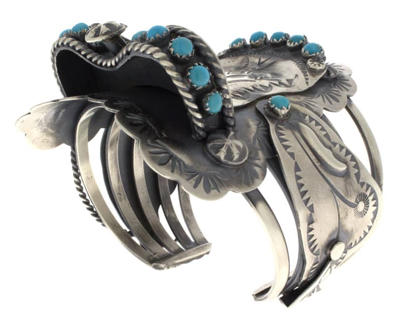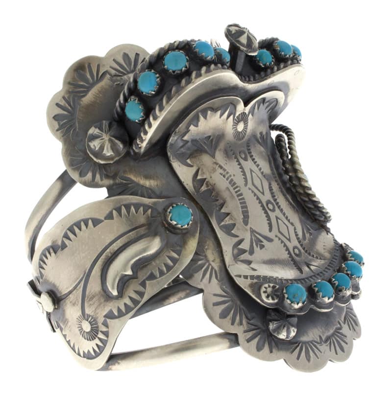"Old Style" Sterling Silber Sattelarmband, dekoriert mit 17 Kingman Türkissteinen. Meisterhaft handgefertigt und entworfen von dem Navajo-Künstler TIM YAZZIE.