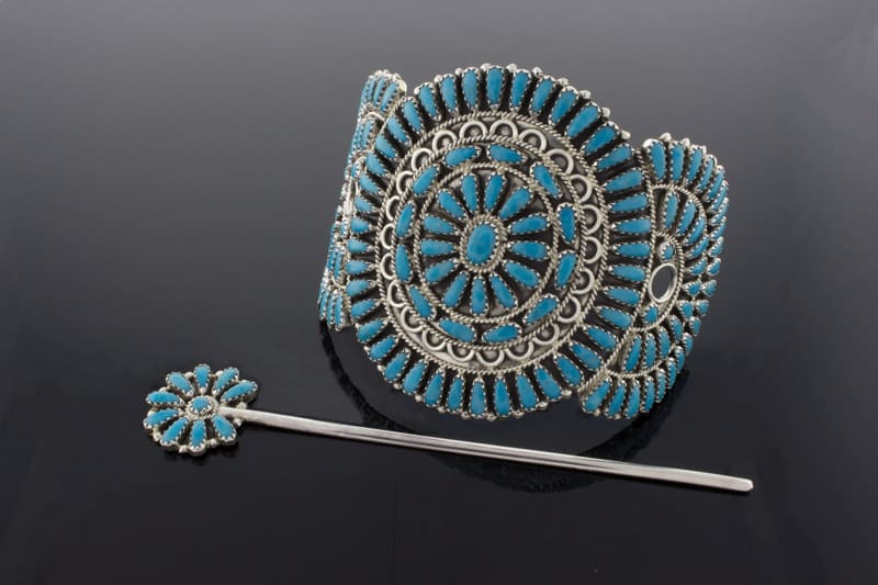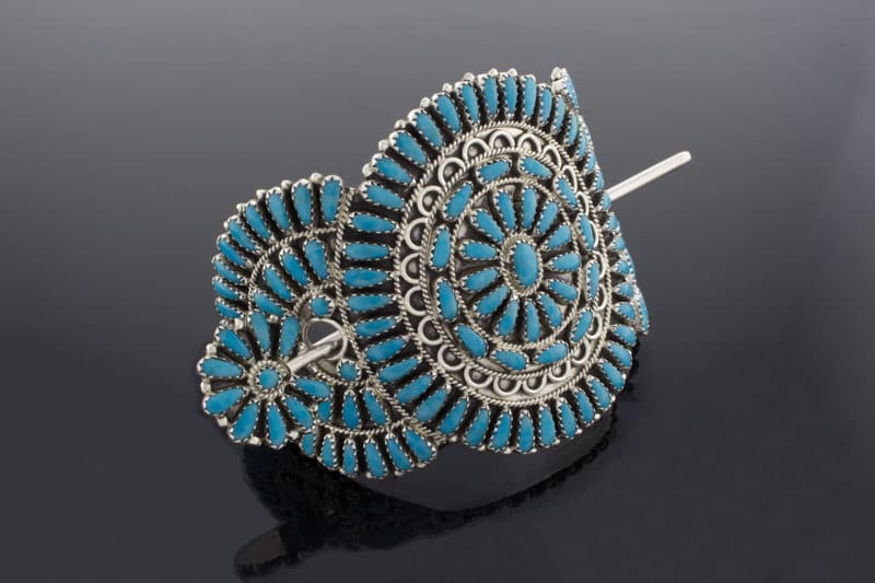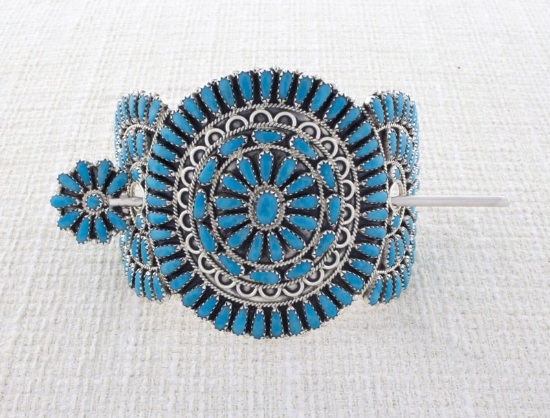 Schlafende Schönheit Türkis Petit Point Cluster Pferdeschwanzhalter mit Stecknadel, meisterhaft handgefertigt und entworfen von der Navajo-Künstlerin ZEITA BEGAY.