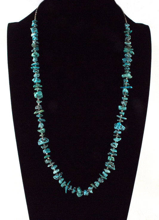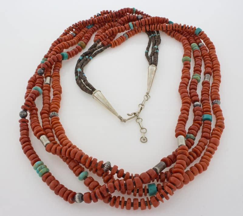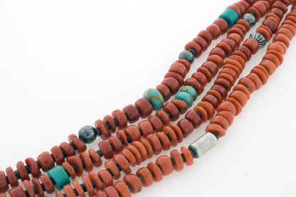 4-strängige hochwertige natürliche mediterrane Korallenperlenkette, handgefertigt und entworfen von der Navajo-Künstlerin HELEN TSOSIE. Kette entworfen mit Pen Shell Heishi, Sterlingsilber und Kingman-Turquoise-Abstandshaltern. Pen Shell Heishi mit Kingman-Turquoise-Abstandshaltern am Ende der Kette. Sterlingsilberkegel mit verstellbarem Sterlingsilber "Haken & Öse"-Verbinder.