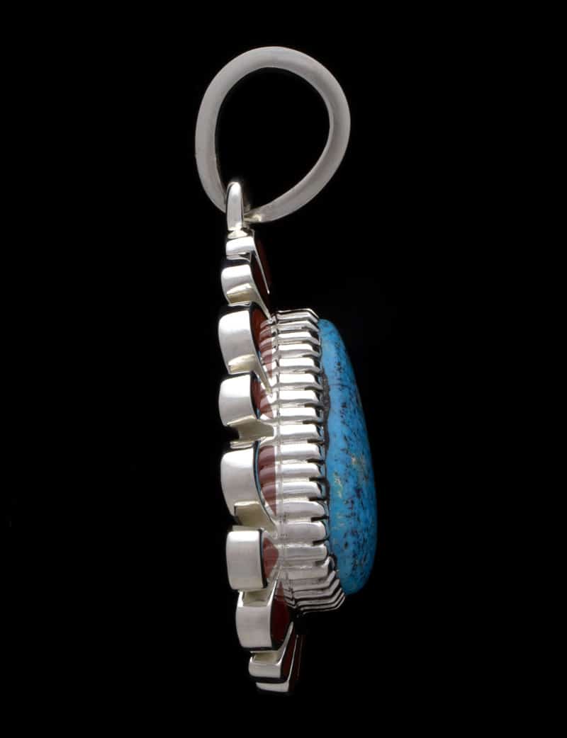 Schwerer Sterling-Silber-Anhänger, besetzt mit einem tropfenförmigen, hochgradigen natürlichen Kingman-Turquoise-Stein und eingelegt mit hochgradigem natürlichem mediterranem Korallen. Meisterhaft handgefertigt und entworfen von dem preisgekrönten Navajo-Künstler VERNON HASKIE.
