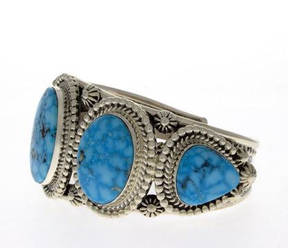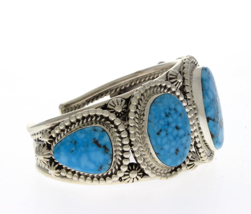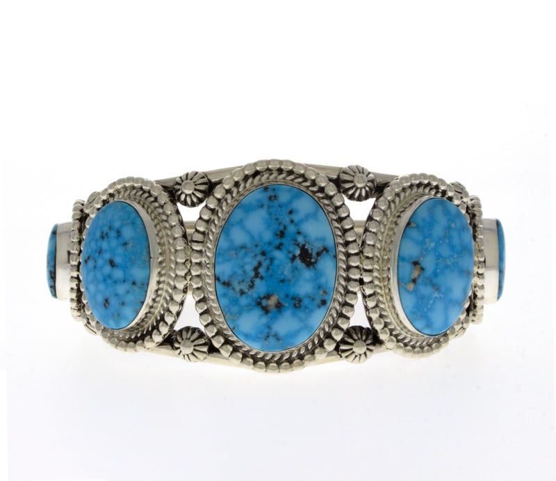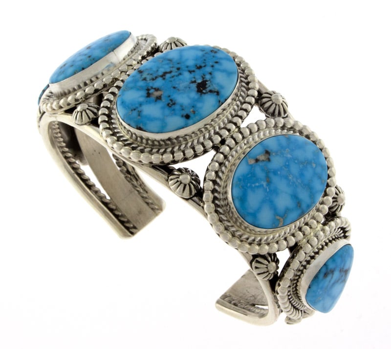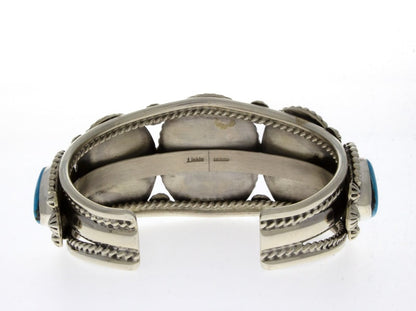 Sterling Silber Armband Set Mit Einer Reihe Von 5 Hochwertigen Natürlichen Kingman Wasser-Web Türkissteinen. Meisterhaft Handgefertigt Und Entworfen Von Der Navajo-Künstlerin LUCINDA LINKIN.