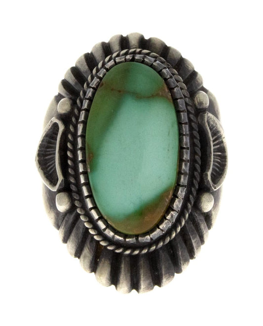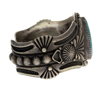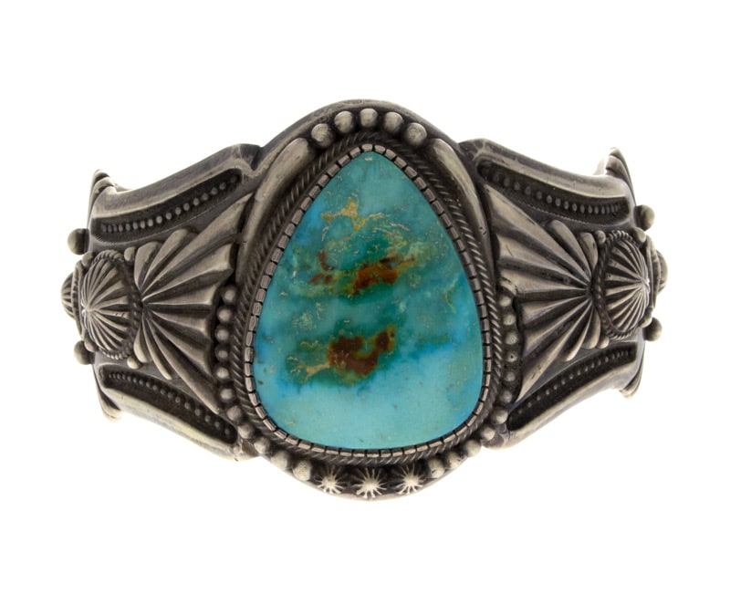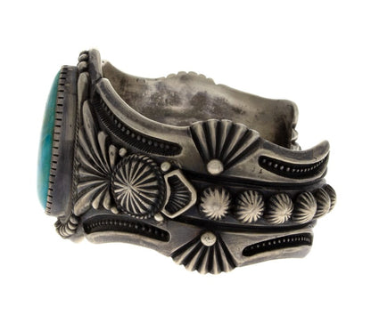 "Old Style" schwere Gauge Sterlingsilberbarrenarmband mit einem großen, birnenförmigen, hochgradigen natürlichen Pilot Mountain Türkisstein. Meisterhaft handgefertigt und entworfen von dem Navajo-Künstler HARRY H. BEGAY.