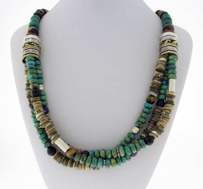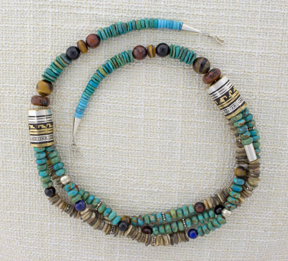 24" Länge Kingman Türkis Perlenkette mit verschiedenen Halbedelsteinen und 12K Goldüberzug auf Sterlingsilber-Fassperlen. Wunderschön handgefertigt und entworfen von der Navajo-Künstlerin ROSE SINGER.