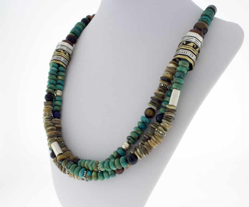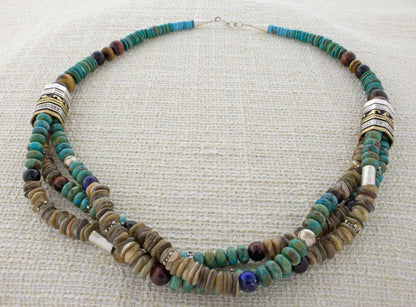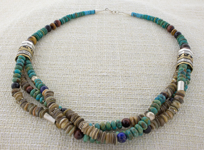 • Materials:  Kingman Turquoise Nuggets, Handmade Sterling Silver Barrel Beads, Handmade 12K Gold-Filled Overlay On Sterling Silver Barrel Beads, Sterling Silver Bead Spacers, Assorted Semi-Precious Stones, Sterling Silver Cones and Connector