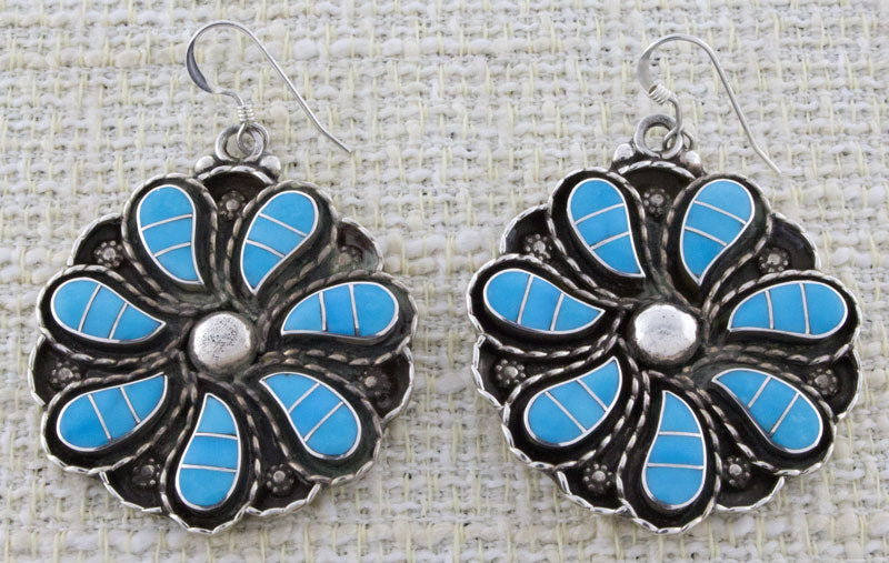 Französische Draht-Ohrstecker aus Sterlingsilber, jeweils mit Kingman-Türkissteinen eingelegt. Meisterhaft handgefertigt und entworfen von der Zuni-Künstlerin FAYETTE LOWSAYATEE.