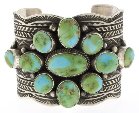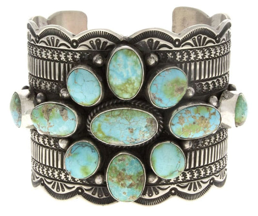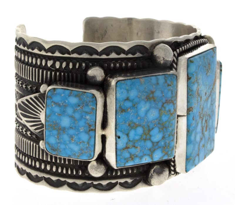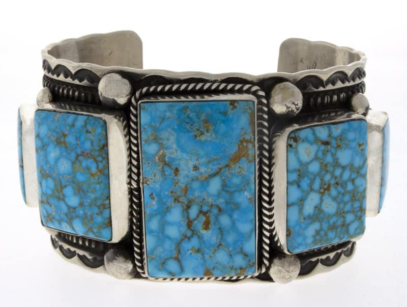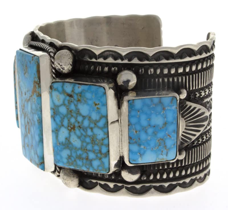"Old Style" Sterlingsilberarmband mit einer Reihe von 5 großen natürlichen Birdseye Kingman Türkissteinen. Meisterhaft handgefertigt und entworfen von dem Navajo-Künstler GUY HOSKIE.