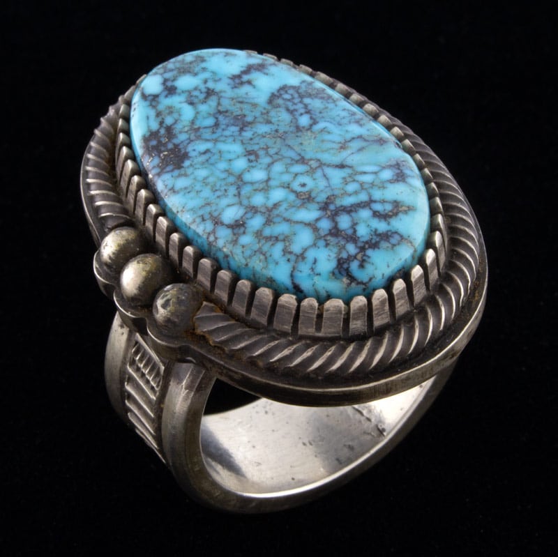 Größe 10,75 schwerer Gauge Sterlingsilber "Old Style" Ring mit einem großen ovalen natürlichen Freiform-Kingman-Turquoise-Stein. Meisterhaft handgefertigt und entworfen von dem Navajo-Künstler TOMMY JACKSON.