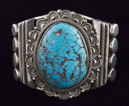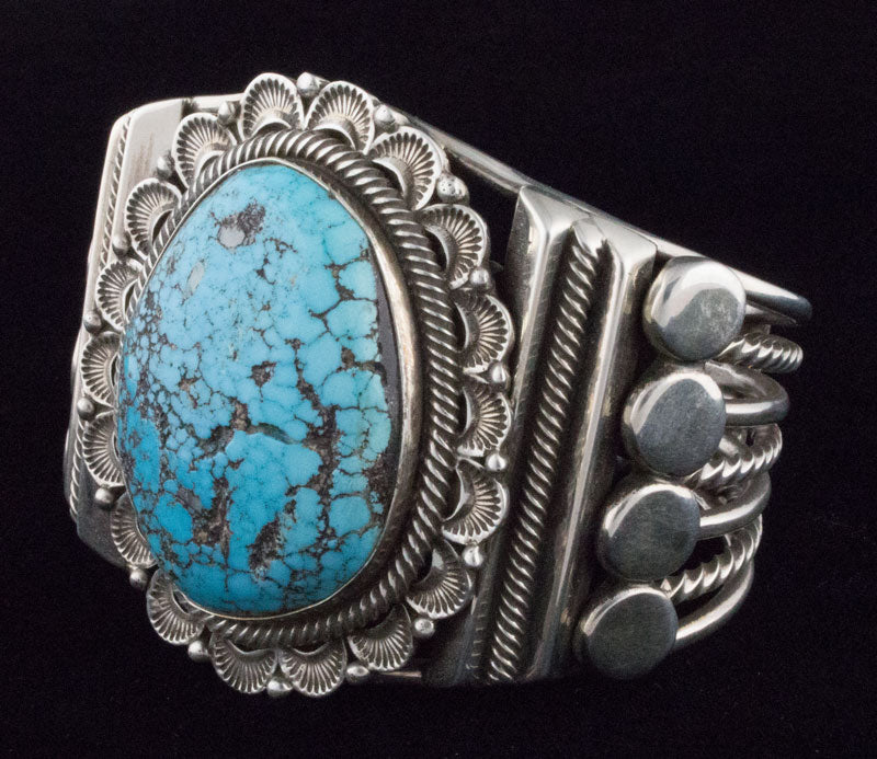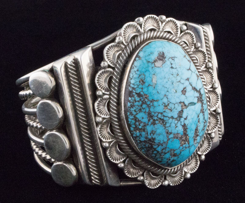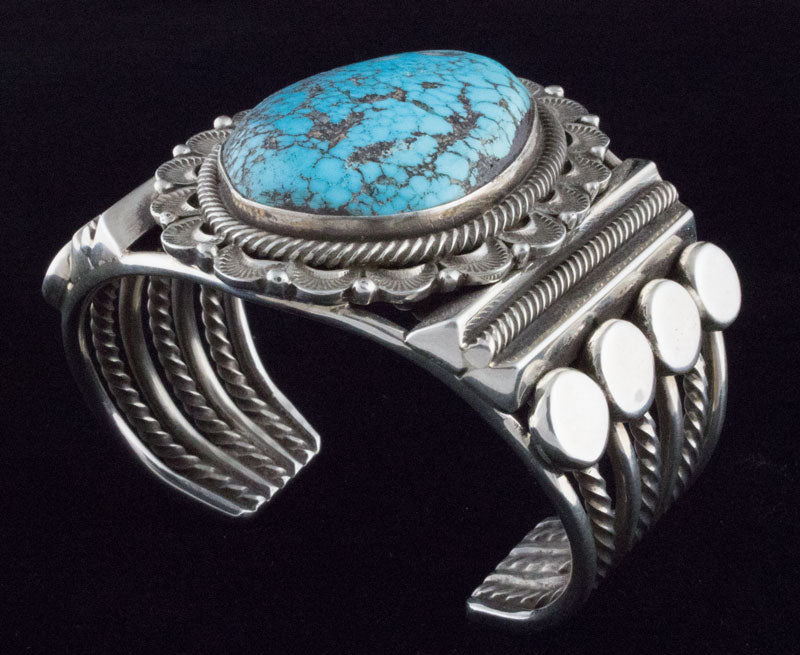 "Old Style" Sterlingsilberarmband mit einem handgeschnittenen natürlichen Kingman-Turquoise-Stein. Meisterhaft handgefertigt und entworfen von dem Navajo-Künstler RICK MARTINEZ.