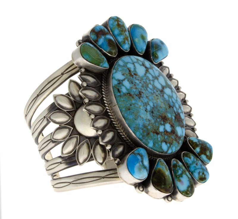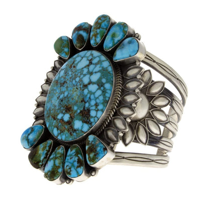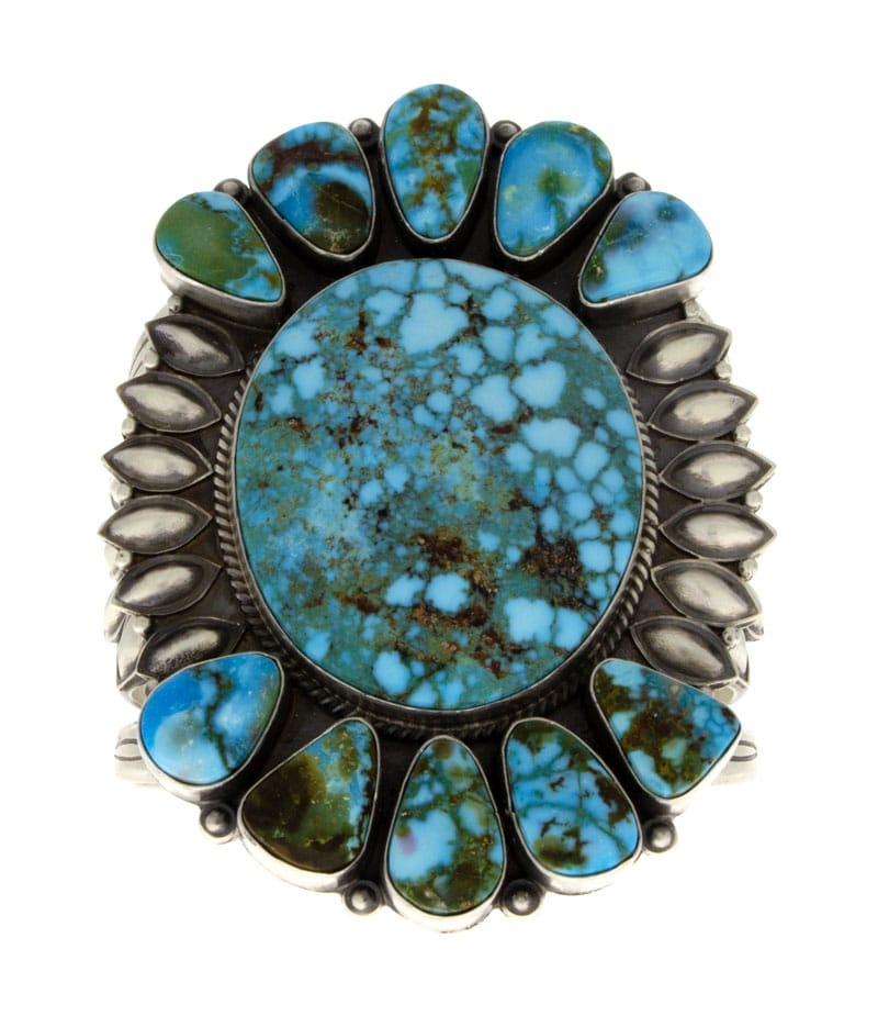 "Old Style" Sterlingsilberarmband, das mit einem beeindruckenden natürlichen Kingman-Turquoise-Zentralstein besetzt ist und ergänzt wird durch einen Cluster von 10 kleineren, tropfenförmigen natürlichen Kingman-Turquoise-Steinen. Meisterhaft handgefertigt und entworfen von dem Navajo-Künstler DERRICK GORDON.