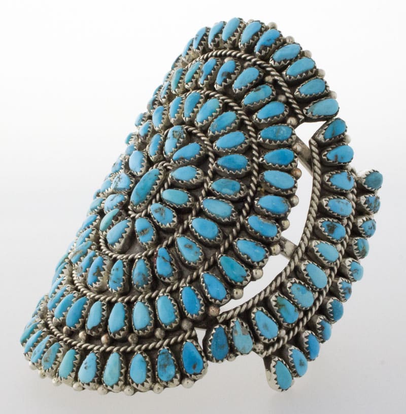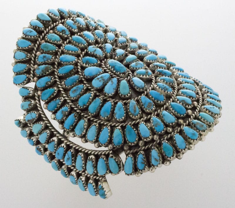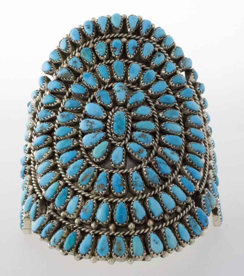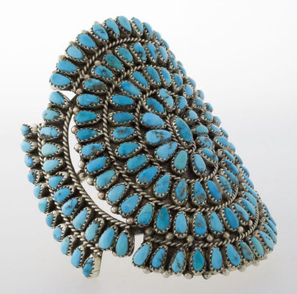 Sterling-Silber-Armband mit einem aufwendigen Cluster aus RARE natürlichen Sleeping Beauty Turquoise Petit Point Steinen. Meisterhaft handgefertigt und entworfen von der Navajo-Künstlerin JUSTINA WILSON.