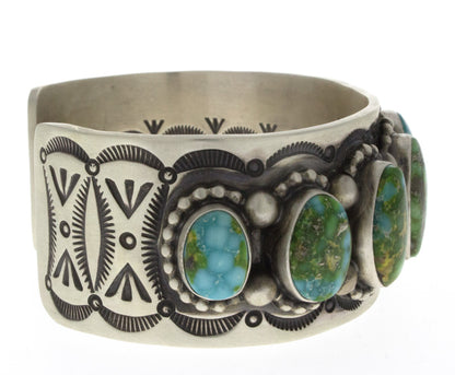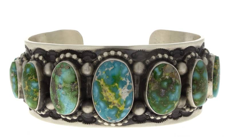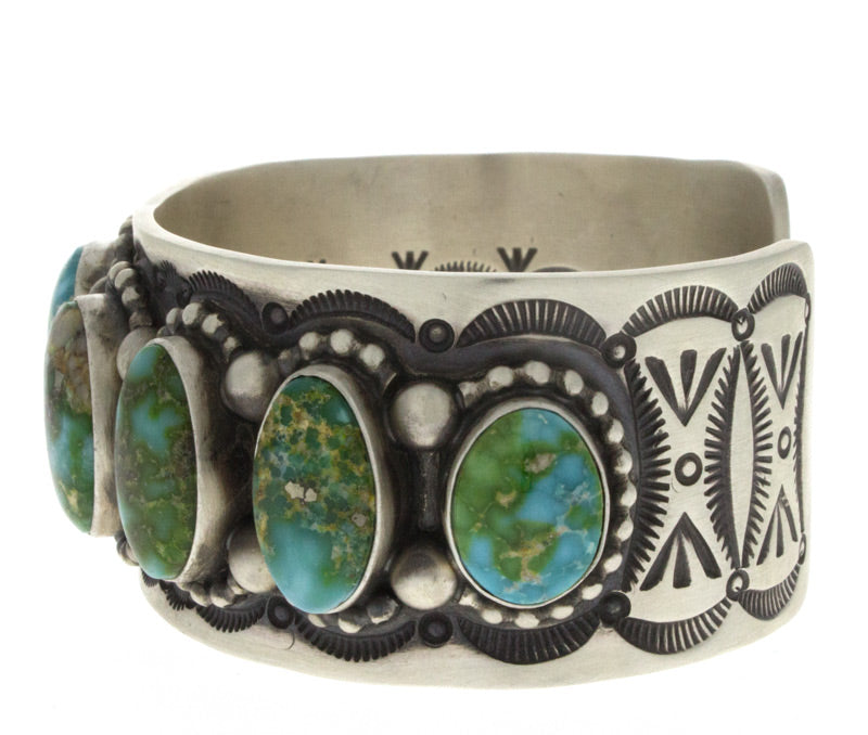 "Old Style" Sterlingsilberarmband mit einer Reihe von 9 Sonoran Gold Türkissteinen. Meisterhaft handgefertigt und entworfen von dem Navajo-Künstler HERMAN SMITH.