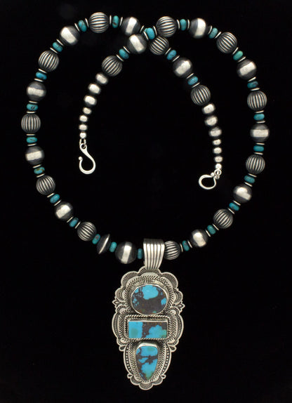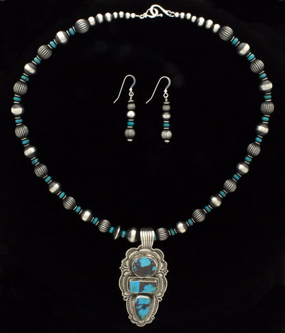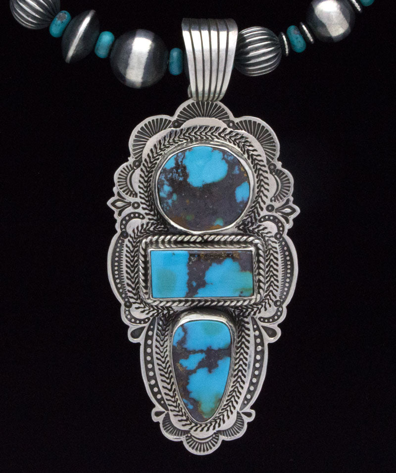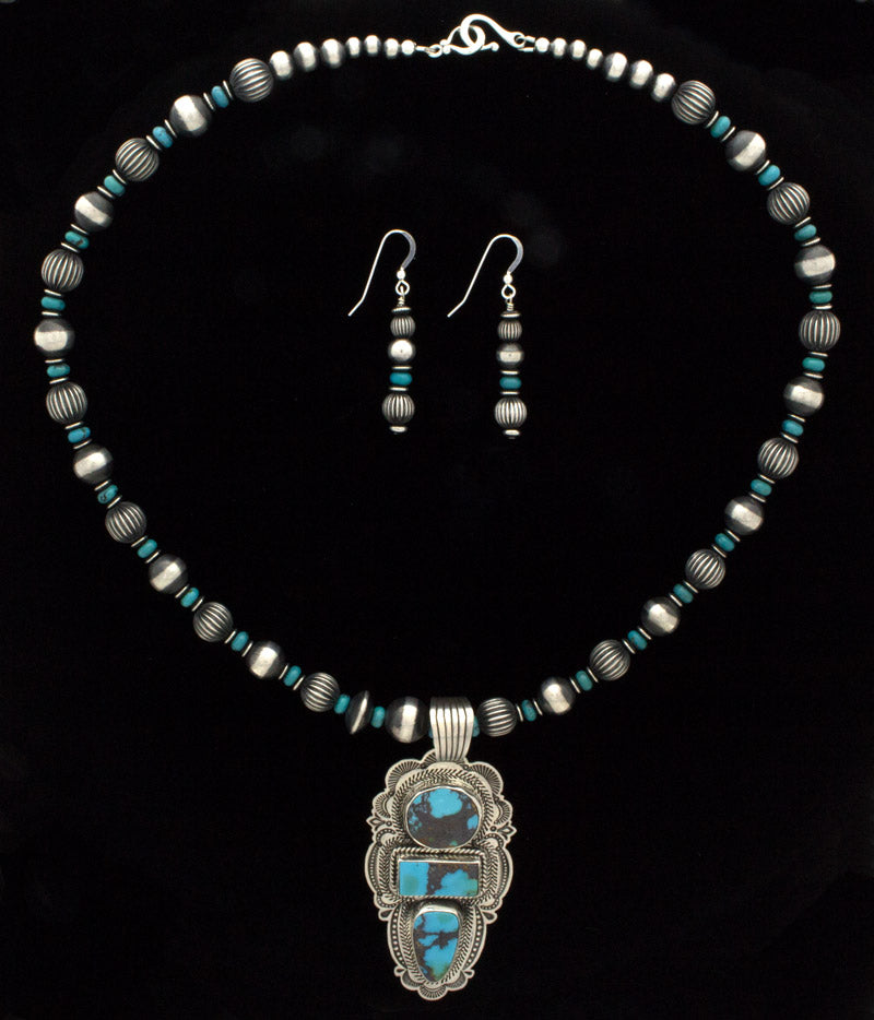 Sterling-Silber-Anhänger mit 3 natürlichen Türkis-Mountain-Türkis-Steinen, aufgehängt an einer 22" Sterling-Silber- und Türkis-Perlenkette. Das Set umfasst passende Ohrringe aus Sterling-Silber und Türkis-Perlen. Der Anhänger ist meisterhaft von dem Navajo-Künstler ALBERT JAKE handgefertigt und entworfen. Kette und passende Ohrringe sind meisterhaft von der Navajo-Künstlerin MARILYN PLATERO handgefertigt und entworfen. Im Allgemeinen gilt natürlicher oder unbehandelter Türkis als sehr begehrenswert, da er die wahre und unveränderte Zusammensetzung des Steins repräsentiert. Natürliche Türkis-Steine werden zunehmend schwer zu beschaffen und sind bei vielen anspruchsvollen Sammlern sehr begehrt.