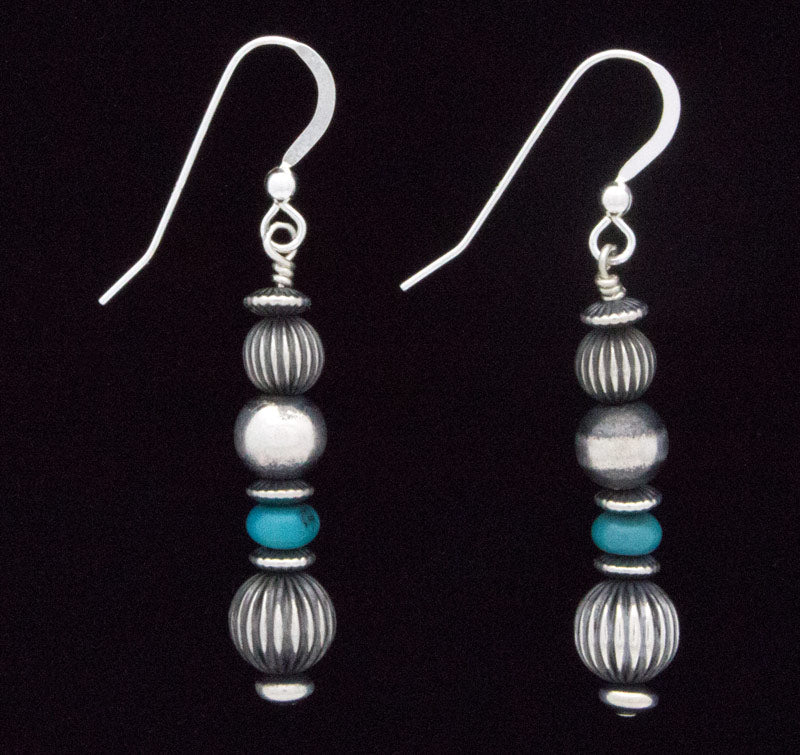 • Earrings Description:  Same Satin Finish Sterling Silver And Turquoise Beads As Were Used For Necklace; Width Of Sterling Silver Beads Range Approximately From 5 mm to 8s mm; Width Of 2 Turquoise Beads Are Approximately 5.5 mm.