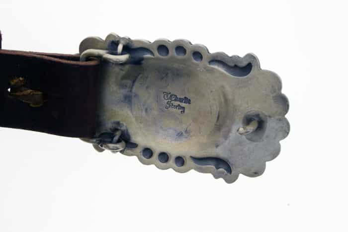 Echter Leder Gürtel einschließlich 8 Sterling Silber Conchos, 9 Sterling Silber "Schmetterling" Abstandshalter und einer Sterling Silber Schnalle, die jeweils mit einem Türkisstein besetzt sind. Meisterhaft handgefertigt und entworfen von dem Navajo-Künstler THOMAS CHARLIE. Alle Conchos und Schmetterlingsabstandshalter mit Lederunterlage.