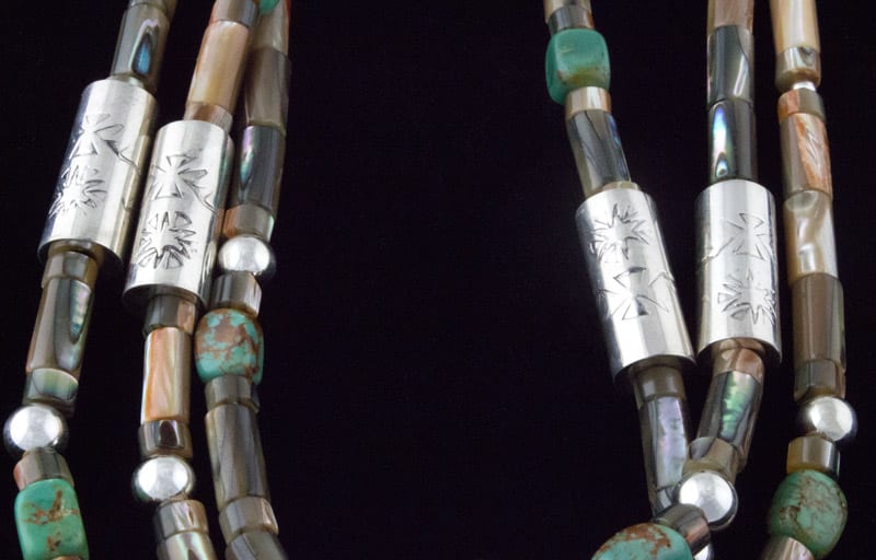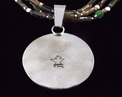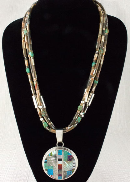 Collier en perles tubulaires d'abalone à 3 brins, longueur ajustable de 24" à 27", avec des perles de turquoise Kingman, des perles en argent sterling en forme de baril et des séparateurs de perles en argent sterling. Le collier comprend un pendentif en inlay multi-pierres en argent sterling. Aucun matériau imitation utilisé. Fait à la main et conçu de manière magistrale par l'artiste de Santo Domingo Pueblo DANIEL CORIZ.