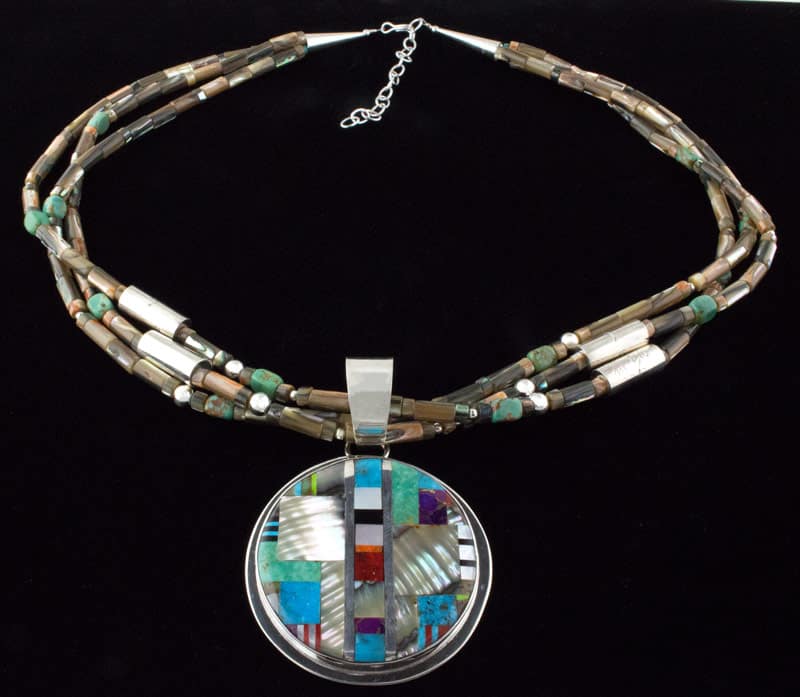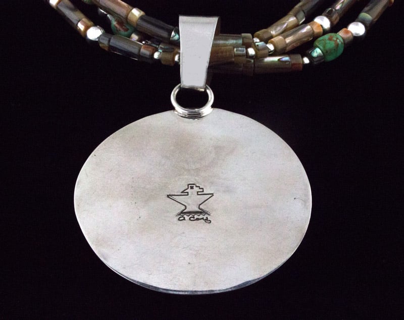 • Matériaux/technique du pendentif : argent sterling ; incrustation de pierres et coquillages divers en canal et pierre sur pierre, dont la nacre blanche, la turquoise Kingman, la turquoise verte du Nevada, l'huître épineuse orange, le corail, le jais, le violet Mohave et l'ormeau.