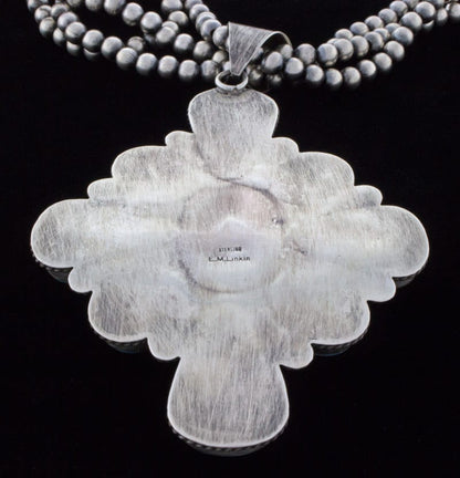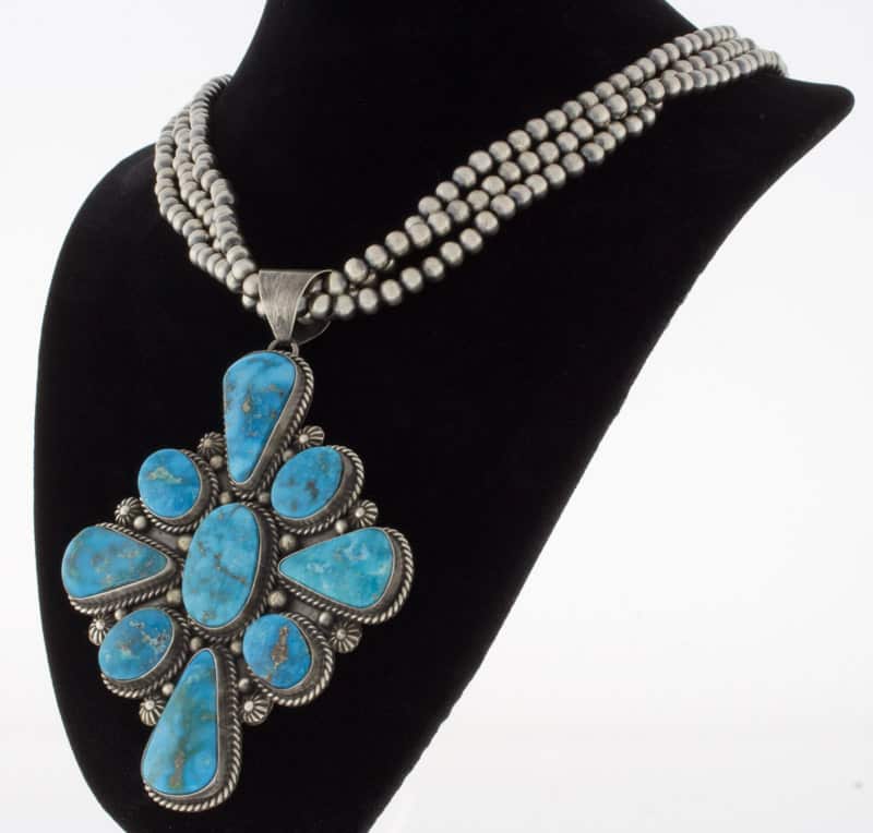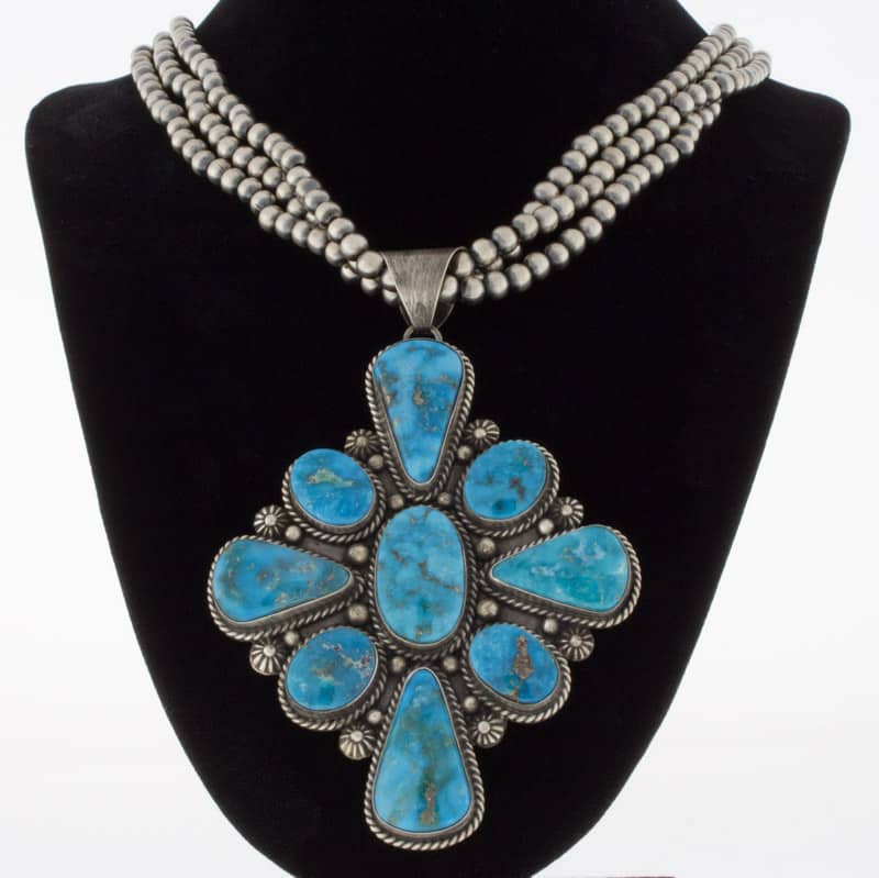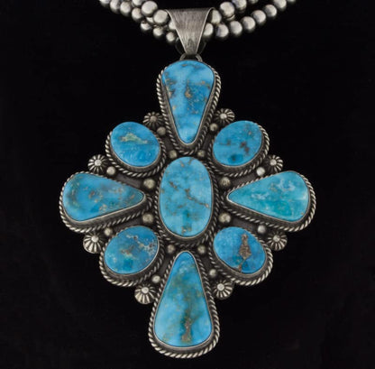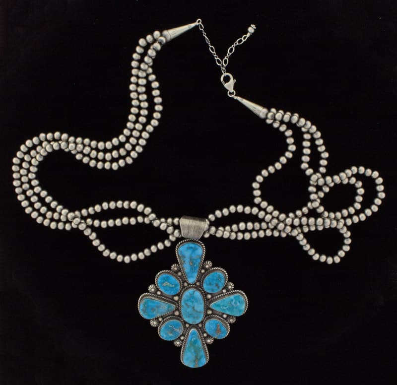 "Longueur réglable de 22,5" à 24,75" Collier en perles en argent sterling à 3 brins "Old Style" avec un pendentif en argent sterling "Old Style" orné d'un cluster de 9 pierres de turquoise naturelle Blue Ridge de haute qualité, extraites et taillées à la main dans le comté de Lander, Nevada, vers la fin des années 1980. Collier habilement fabriqué à la main par l'artiste navajo LULA NEZ. Pendentif magistralement fait à la main et conçu par l'artiste navajo ELLA M. LINKIN.  *Le pendentif et le collier peuvent être achetés séparément. Appelez ou envoyez un e-mail pour les prix.