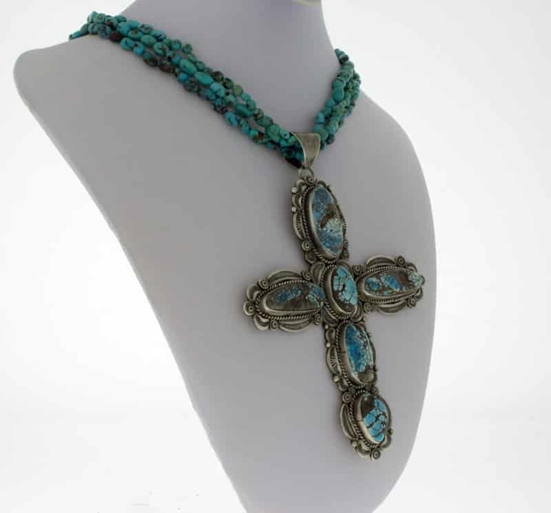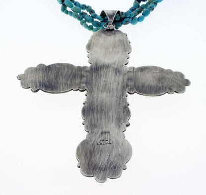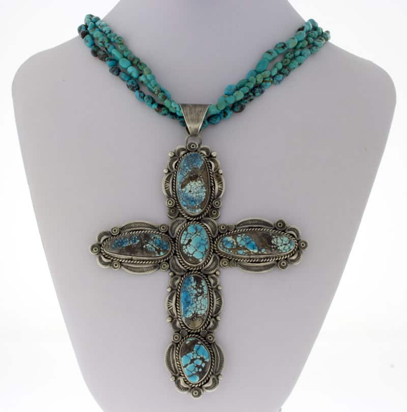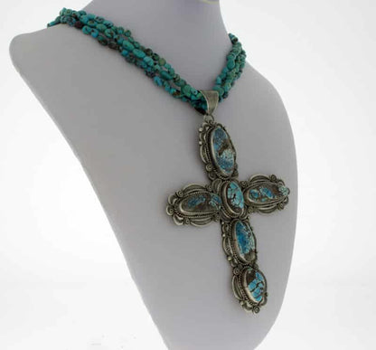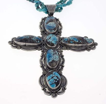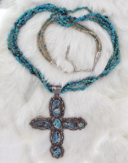 "Longueur ajustable de 28,75" à 32". Collier en perles de turquoise et heishi d'olive à 3 brins avec un pendentif croix en argent sterling de style ancien serti de 6 pierres de turquoise naturelle de haute qualité de Lone Mountain. Collier magistralement fait à la main et conçu par l'artiste navajo VERLYN YATASATTIE. Pendentif magistralement fait à la main et conçu par l'artiste navajo ELLA M. LINKIN. *Le pendentif et le collier peuvent être achetés séparément. Appelez ou envoyez un e-mail pour les prix."