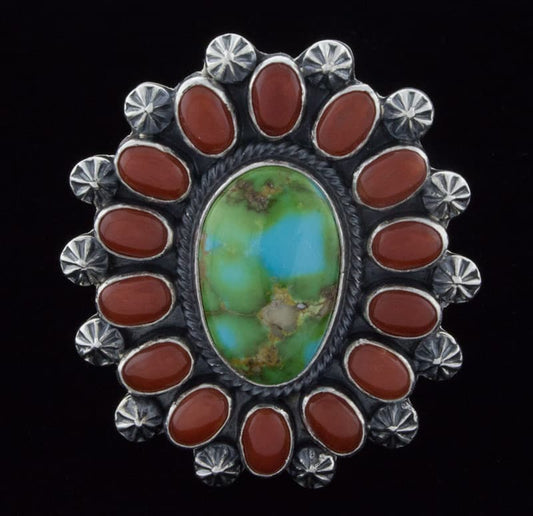 Anello Dichiarazione in Ostra Spinosa Rossa/Arancione con Cornice in Turchese Kingman e Corallo