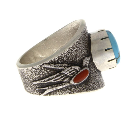 Anello in Tufa con Rondine e Turchese Naturale Lone Mountain & Corallo