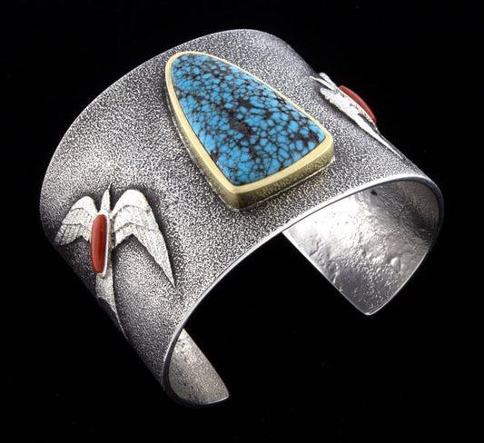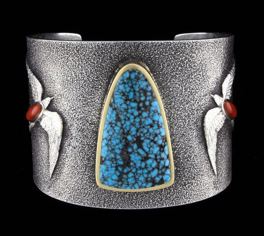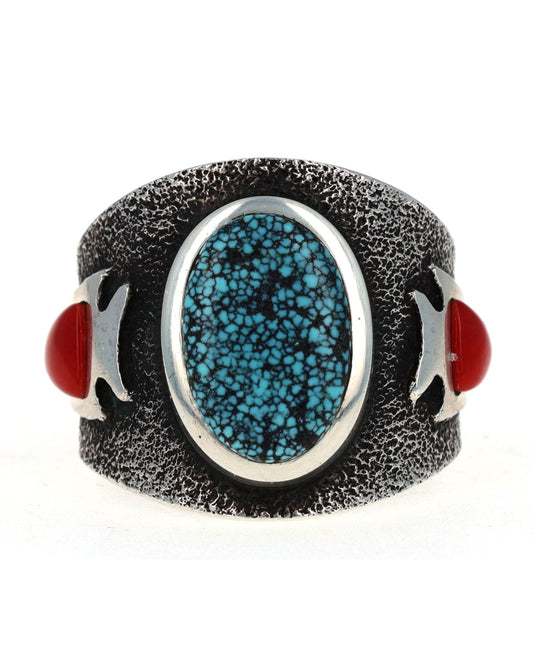 Calvin Martinez is a reputable silversmith who often creates classic, traditional Navajo jewelry featuring turquoise and coral. His work is heavily influenced by Native American jewelry designs from over a century ago. Calvin also uses historical techniques, such as forging his pieces by melting old and scrap silver into ingots, which are then hand-rolled and hammered into the desired thickness. His pieces have been showcased in galleries and shows as well as private collections worldwide. The artist was awarded first place at the prestigious Inter-Tribal Indian Ceremonial in Gallup, New Mexico.